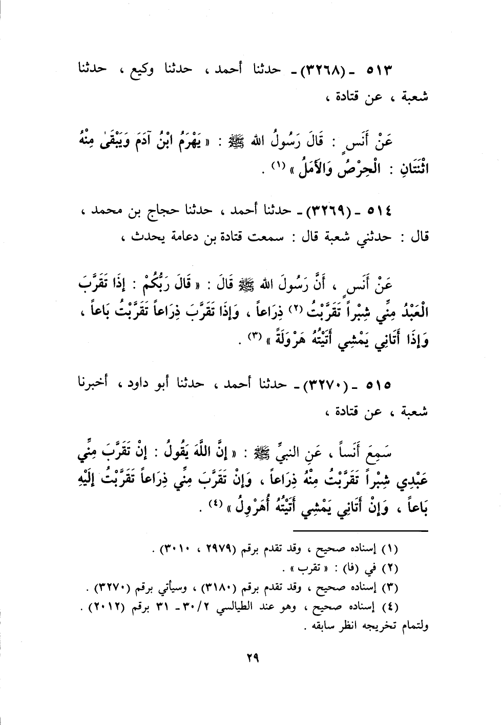 3270 - حَدَّثَنَا أَحْمَدُ، حَدَّثَنَا أَبُو دَاوُدَ، أَخْبَرَنَا شُعْبَةُ، عَنْ قَتَادَةَ، سَمِعَ أَنَسًا، عَنِ النَّبِيِّ صَلَّى اللهُ عَلَيْهِ وَسَلَّمَ: " إِنَّ اللَّهَ يَقُولُ: §إِنْ تَقَرَّبَ مِنِّي عَبْدِي شِبْرًا تَقَرَّبْتُ مِنْهُ ذِرَاعًا، وَإِنْ تَقَرَّبَ مِنِّي ذِرَاعًا تَقَرَّبْتُ إِلَيْهِ بَاعًا، وَإِنْ أَتَانِي يَمْشِي أَتَيْتُهُ أُهَرْوِلُ "Kإسناده صحيح
