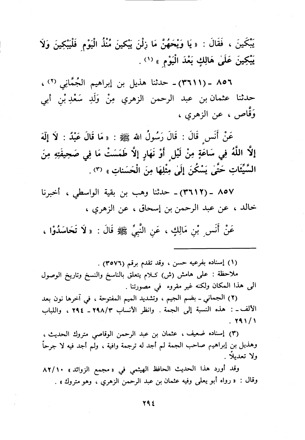 3612 - حَدَّثَنَا وَهْبُ بْنُ بَقِيَّةَ الْوَاسِطِيُّ، أَخْبَرَنَا خَالِدٌ، عَنْ عَبْدِ الرَّحْمَنِ بْنِ إِسْحَاقَ، عَنِ الزُّهْرِيِّ، عَنْ أَنَسِ بْنِ مَالِكٍ، عَنِ النَّبِيِّ صَلَّى اللهُ عَلَيْهِ وَسَلَّمَ قَالَ: «§لَا تَحَاسَدُوا، وَلَا تَنَافَسُوا، وَلَا تَبَاغَضُوا، وَلَا تَدَابَرُوا، وَكُونُوا عِبَادَ اللَّهِ إِخْوَانًا، وَلَا يَحِلُّ لِرَجُلٍ أَنْ يَهْجُرَ أَخَاهُ فَوْقَ ثَلَاثَةِ أَيَّامٍ» Kإسناده صحيح