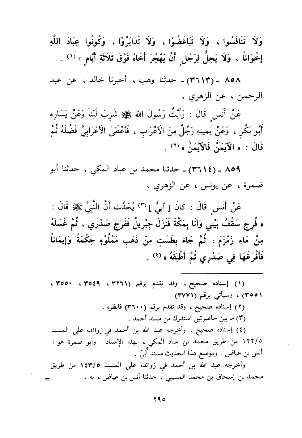 3614 - حَدَّثَنَا مُحَمَّدُ بْنُ عَبَّادٍ الْمَكِّيُّ، حَدَّثَنَا أَبُو ضَمْرَةَ، عَنْ يُونُسَ، عَنِ الزُّهْرِيِّ، عَنْ أَنَسٍ قَالَ: كَانَ أُبَيٌّ يُحَدِّثُ أَنَّ النَّبِيَّ صَلَّى اللهُ عَلَيْهِ وَسَلَّمَ قَالَ: «§فُرِجَ سَقْفُ بَيْتِي وَأَنَا بِمَكَّةَ، فَنَزَلَ جِبْرِيلُ فَفَرَجَ صَدْرِي ثُمَّ غَسَلَهُ مِنْ مَاءِ زَمْزَمَ، ثُمَّ جَاءَ بِطَسْتٍ مِنْ ذَهَبٍ مَمْلُوءٍ حِكْمَةً وَإِيمَانًا فَأَفْرَغَهَا فِي صَدْرِي ثُمَّ أَطْبَقَهُ» Kإسناده صحيح