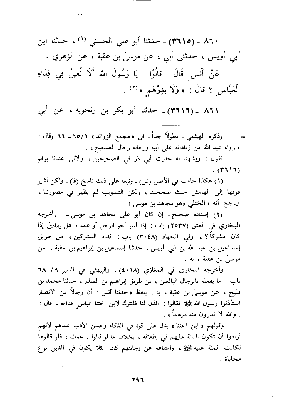 3615 - حَدَّثَنَا أَبُو عَلِيٍّ الْحَسَنِيُّ، حَدَّثَنَا ابْنُ أَبِي أُوَيْسٍ، حَدَّثَنِي أَبِي، عَنْ مُوسَى بْنِ عُقْبَةَ، عَنِ الزُّهْرِيِّ، عَنْ أَنَسٍ قَالَ: قَالُوا: يَا رَسُولَ اللَّهِ، §أَلَا نُعِينُ فِي فِدَاءِ الْعَبَّاسِ؟ قَالَ: «وَلَا بِدِرْهَمٍ» Kإسناده صحيح