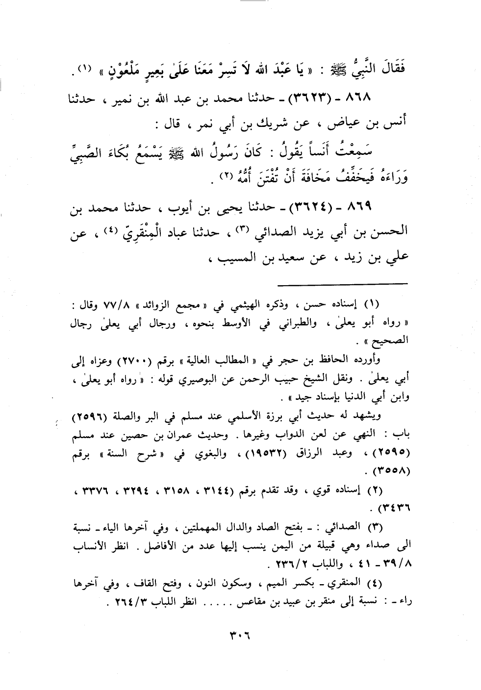 3623 - حَدَّثَنَا مُحَمَّدُ بْنُ عَبْدِ اللَّهِ بْنِ نُمَيْرٍ، حَدَّثَنَا أَنَسُ بْنُ عِيَاضٍ، عَنْ شَرِيكِ بْنِ أَبِي نَمِرٍ قَالَ: سَمِعْتُ أَنَسًا يَقُولُ: «كَانَ رَسُولُ اللَّهِ صَلَّى اللهُ عَلَيْهِ وَسَلَّمَ §يَسْمَعُ بُكَاءَ الصَّبِيِّ وَرَاءَهُ فَيُخَفِّفُ مَخَافَةَ أَنْ تُفْتَنَ أُمُّهُ» Kإسناده قوي