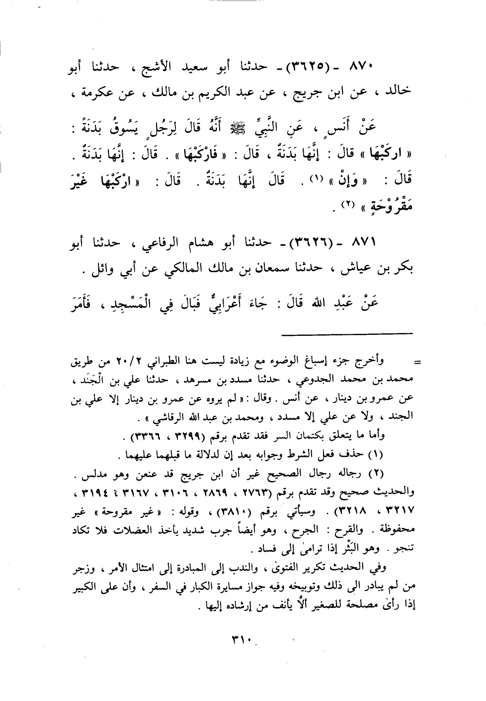 3625 - حَدَّثَنَا أَبُو سَعِيدٍ الْأَشَجُّ، حَدَّثَنَا أَبُو خَالِدٍ، عَنِ ابْنِ جُرَيْجٍ، عَنْ عَبْدِ الْكَرِيمِ بْنِ مَالِكٍ، عَنْ عِكْرِمَةَ، عَنْ أَنَسٍ، عَنِ النَّبِيِّ صَلَّى اللهُ عَلَيْهِ وَسَلَّمَ أَنَّهُ قَالَ لِرَجُلٍ يَسُوقُ بَدَنَةً: «ارْكَبْهَا»، قَالَ: إِنَّهَا بَدَنَةٌ، قَالَ: «فَارْكَبْهَا»، قَالَ: إِنَّهَا بَدَنَةٌ، قَالَ: «وَإِنْ»، قَالَ: إِنَّهَا بَدَنَةٌ، قَالَ: «§ارْكَبْهَا غَيْرَ مَقْرُوحَةٍ» Kرجاله رجال الصحيح والحديث صحيح