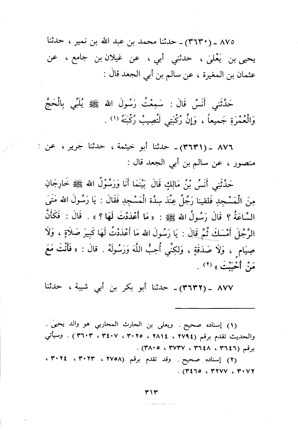 3631 - حَدَّثَنَا أَبُو خَيْثَمَةَ، حَدَّثَنَا جَرِيرٌ، عَنْ مَنْصُورٍ، عَنْ سَالِمِ بْنِ أَبِي الْجَعْدِ قَالَ: حَدَّثَنِي أَنَسُ بْنُ مَالِكٍ قَالَ: بَيْنَمَا أَنَا وَرَسُولُ اللَّهِ صَلَّى اللهُ عَلَيْهِ وَسَلَّمَ خَارِجَانِ مِنَ الْمَسْجِدِ فَلَقِيَنَا رَجُلٌ عِنْدَ سُدَّةِ الْمَسْجِدِ، فَقَالَ: يَا رَسُولَ اللَّهِ، مَتَى السَّاعَةُ؟ قَالَ رَسُولُ اللَّهِ صَلَّى اللهُ عَلَيْهِ وَسَلَّمَ: «مَا أَعْدَدْتَ لَهَا؟» قَالَ: فَكَأَنَّ الرَّجُلَ أَمْسَكَ، ثُمَّ قَالَ: يَا رَسُولَ اللَّهِ، مَا أَعْدَدْتُ لَهَا كَبِيرَ صَلَاةٍ وَلَا صِيَامٍ وَلَا صَدَقَةٍ، وَلَكِنِّي أُحِبُّ اللَّهَ وَرَسُولَهُ، قَالَ: «§فَأَنْتَ مَعَ مَنْ أَحْبَبْتَ» Kإسناده صحيح