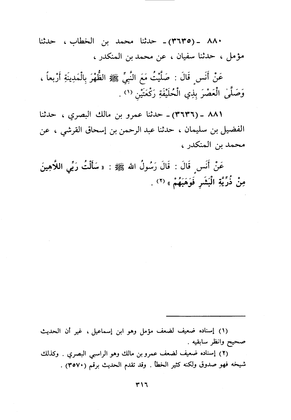 3635 - حَدَّثَنَا مُحَمَّدُ بْنُ الْخَطَّابِ، حَدَّثَنَا مُؤَمَّلٌ، حَدَّثَنَا سُفْيَانُ، عَنْ مُحَمَّدِ بْنِ الْمُنْكَدِرِ، عَنْ أَنَسٍ قَالَ: «§صَلَّيْتُ مَعَ النَّبِيِّ صَلَّى اللهُ عَلَيْهِ وَسَلَّمَ الظُّهْرَ بِالْمَدِينَةِ أَرْبَعًا، وَصَلَّى الْعَصْرَ بِذِي الْحُلَيْفَةِ رَكْعَتَيْنِ» Kإسناده ضعيف