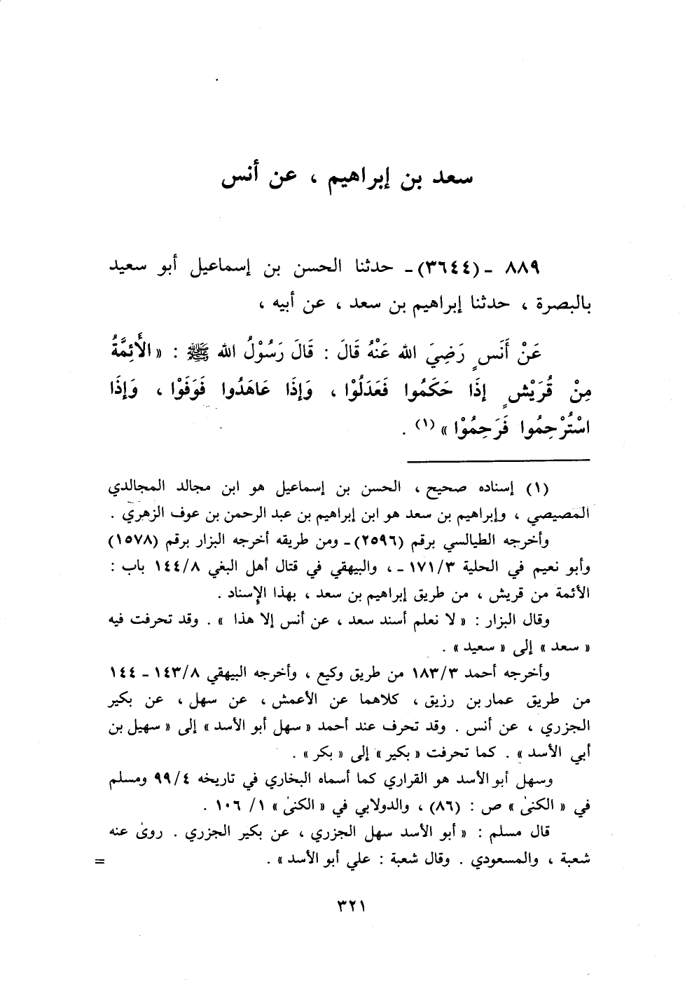 3644 - حَدَّثَنَا الْحَسَنُ بْنُ إِسْمَاعِيلَ أَبُو سَعِيدٍ، بِالْبَصْرَةِ، حَدَّثَنَا إِبْرَاهِيمُ بْنُ سَعْدٍ، عَنْ أَبِيهِ، عَنْ أَنَسٍ رَضِيَ اللَّهُ عَنْهُ قَالَ: قَالَ رَسُولُ اللَّهِ صَلَّى اللهُ عَلَيْهِ وَسَلَّمَ: «§الْأَئِمَّةُ مِنْ قُرَيْشٍ، إِذَا حَكَمُوا فَعَدَلُوا، وَإِذَا عَاهَدُوا فَوَفَوْا، وَإِذَا اسْتُرْحِمُوا فَرَحِمُوا» Kإسناده صحيح
