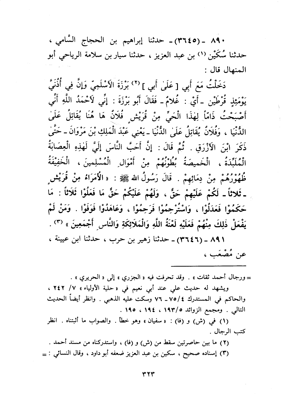 3645 - حَدَّثَنَا إِبْرَاهِيمُ بْنُ الْحَجَّاجِ السَّامِيُّ، حَدَّثَنَا سِكِّينُ بْنُ عَبْدِ الْعَزِيزِ، حَدَّثَنَا سَيَّارُ بْنُ سَلَامَةَ الرِّيَاحِيُّ أَبُو الْمِنْهَالِ قَالَ: دَخَلْتُ مَعَ أَبِي عَلَى أَبِي بَرْزَةَ الْأَسْلَمِيِّ، وَإِنَّ فِي أُذُنَيَّ يَوْمَئِذٍ قُرْطَيْنِ - أَيْ غُلَامٌ - فَقَالَ أَبُو بَرْزَةَ: إِنِّي لِأَحْمَدُ اللَّهَ أَنِّي أَصْبَحْتُ ذَامًّا لِهَذَا الْحَيِّ مِنْ قُرَيْشٍ، فُلَانٌ هَا هُنَا يُقَاتِلُ عَلَى الدُّنْيَا، وَفُلَانٌ يُقَاتِلُ عَلَى الدُّنْيَا - يَعْنِي: عَبْدَ الْمَلِكِ بْنَ مَرْوَانَ - حَتَّى ذَكَرَ ابْنَ الْأَزْرَقِ، ثُمَّ قَالَ: إِنَّ أَحَبَّ النَّاسِ إِلَيَّ لَهَذِهِ الْعِصَابَةُ الْمُلَبَّدَةُ الْخَمِيصَةُ بُطُونِهِمْ مِنْ أَمْوَالِ الْمُسْلِمِينَ، الْخَفِيفَةُ ظُهُورُهُمْ مِنْ دِمَائِهِمْ، قَالَ رَسُولُ اللَّهِ صَلَّى اللهُ عَلَيْهِ وَسَلَّمَ: " §الْأُمَرَاءُ مِنْ قُرَيْشٍ، ثَلَاثًا، لَكُمْ عَلَيْهِمْ حَقٌّ، وَلَهُمْ عَلَيْكُمْ حَقٌّ مَا فَعَلُوا ثَلَاثًا: مَا حَكَمُوا فَعَدَلُوا، وَاسْتُرْحِمُوا فَرَحِمُوا، وَعَاهَدُوا فَوَفَوْا، وَمَنْ لَمْ يَفْعَلْ ذَلِكَ مِنْهُمْ فَعَلَيْهِ لَعْنَةُ اللَّهِ وَالْمَلَائِكَةِ وَالنَّاسِ أَجْمَعِينَ "Kإسناده صحيح