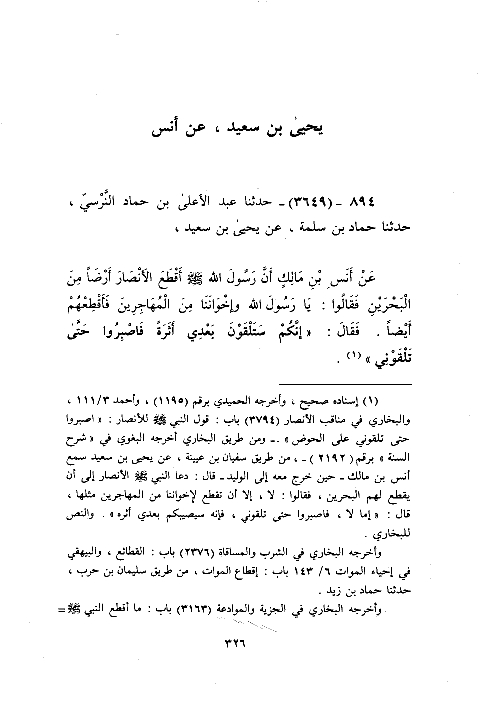 3649 - حَدَّثَنَا عَبْدُ الْأَعْلَى بْنُ حَمَّادٍ النَّرْسِيُّ، حَدَّثَنَا حَمَّادُ بْنُ سَلَمَةَ، عَنْ يَحْيَى بْنِ سَعِيدٍ، عَنْ أَنَسِ بْنِ مَالِكٍ، أَنَّ رَسُولَ اللَّهِ صَلَّى اللهُ عَلَيْهِ وَسَلَّمَ أَقْطَعَ الْأَنْصَارَ أَرْضًا مِنَ الْبَحْرَيْنِ فَقَالُوا: يَا رَسُولَ اللَّهِ، وَإِخْوَانُنَا مِنَ الْمُهَاجِرِينَ فَأَقْطِعْهُمْ أَيْضًا، فَقَالَ: «§إِنَّكُمْ سَتَلْقَوْنَ بَعْدِي أَثَرَةً فَاصْبِرُوا حَتَّى تَلْقَوْنِي» Kإسناده صحيح