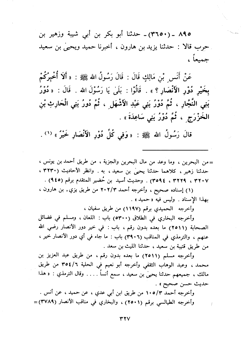 3650 - حَدَّثَنَا أَبُو بَكْرِ بْنُ أَبِي شَيْبَةَ، وَزُهَيْرُ بْنُ حَرْبٍ قَالَا: حَدَّثَنَا يَزِيدُ بْنُ هَارُونَ، أَخْبَرَنَا حُمَيْدٌ، وَيَحْيَى بْنُ سَعِيدٍ، جَمِيعًا عَنْ أَنَسِ بْنِ مَالِكٍ قَالَ: قَالَ رَسُولُ اللَّهِ صَلَّى اللهُ عَلَيْهِ وَسَلَّمَ: «§أَلَا أُخْبِرُكُمْ بِخَيْرِ دُورِ الْأَنْصَارِ؟»، قَالُوا: بَلَى يَا رَسُولَ اللَّهِ، قَالَ: «دُورُ بَنِي النَّجَّارِ، ثُمَّ دُورُ بَنِي عَبْدِ الْأَشْهَلِ، ثُمَّ دُورُ بَنِي الْحَارِثِ بْنِ الْخَزْرَجِ، ثُمَّ دُورُ بَنِي سَاعِدَةَ»، قَالَ رَسُولُ اللَّهِ صَلَّى اللهُ عَلَيْهِ وَسَلَّمَ: «وَفِي كُلِّ دُورِ الْأَنْصَارِ خَيْرٌ»، - وَقَالَ أَحَدُهُمَا فِي حَدِيثِهِ: - وَرَفَعَ بِهَا صَوْتَهُKإسناده صحيح