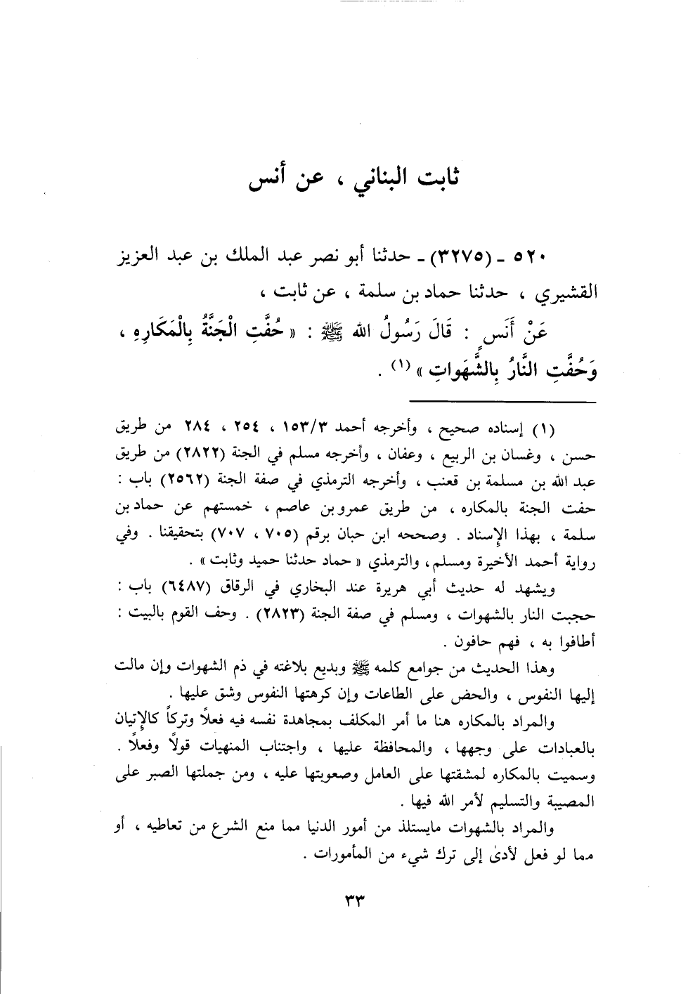 3275 - حَدَّثَنَا أَبُو نَصْرٍ عَبْدُ الْمَلِكِ بْنُ عَبْدِ الْعَزِيزِ الْقُشَيْرِيُّ، حَدَّثَنَا حَمَّادُ بْنُ سَلَمَةَ، عَنْ ثَابِتٍ، عَنْ أَنَسٍ، قَالَ رَسُولُ اللَّهِ صَلَّى اللهُ عَلَيْهِ وَسَلَّمَ: «§حُفَّتِ الْجَنَّةُ بِالْمَكَارِهِ، وَحُفَّتِ النَّارُ بِالشَّهَوَاتِ» Kإسناده صحيح