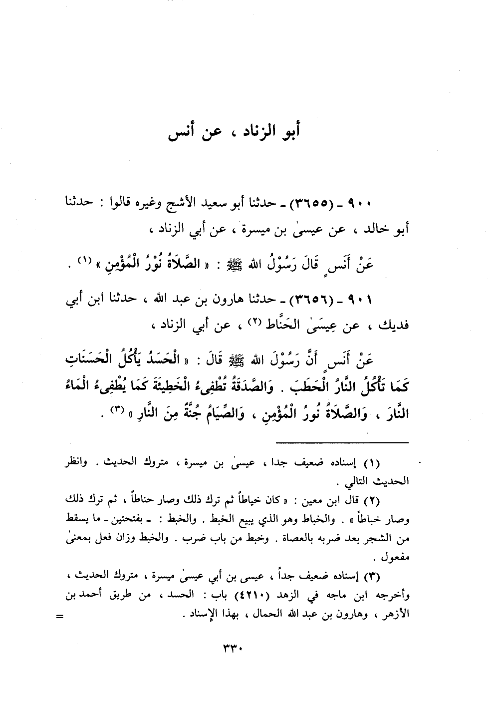3655 - حَدَّثَنَا أَبُو سَعِيدٍ الْأَشَجُّ، وَغَيْرُه، قَالُوا: حَدَّثَنَا أَبُو خَالِدٍ، عَنْ عِيسَى بْنِ مَيْسَرَةَ، عَنْ أَبِي الزِّنَادِ، عَنْ أَنَسٍ، قَالَ رَسُولُ اللَّهِ صَلَّى اللهُ عَلَيْهِ وَسَلَّمَ: «§الصَّلَاةُ نُورُ الْمُؤْمِنِ» Kإسناده ضعيف جدا