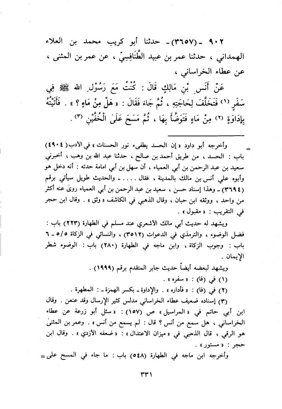 3657 - حَدَّثَنَا أَبُو كُرَيْبٍ مُحَمَّدُ بْنُ الْعَلَاءِ الْهَمْدَانِيُّ، حَدَّثَنَا عُمَرُ بْنُ عُبَيْدٍ الطَّنَافِسِيُّ، عَنْ عُمَرَ بْنِ الْمُثَنَّى، عَنْ عَطَاءٍ الْخُرَاسَانِيِّ، عَنْ أَنَسِ بْنِ مَالِكٍ قَالَ: كُنْتُ مَعَ رَسُولِ اللَّهِ صَلَّى اللهُ عَلَيْهِ وَسَلَّمَ فِي سَفَرٍ §فَتَخَلَّفَ لِحَاجَتِهِ، ثُمَّ جَاءَ فَقَالَ: «هَلْ مِنْ مَاءٍ؟»، فَأَتَيْتُهُ بِإِدَاوَةٍ مِنْ مَاءٍ فَتَوَضَّأَ بِهَا، ثُمَّ مَسَحَ عَلَى الْخُفَّيْنِKإسناده ضعيف