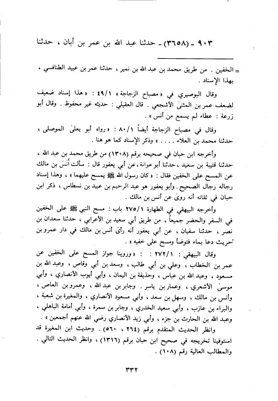 3658 - حَدَّثَنَا عَبْدُ اللَّهِ بْنُ عُمَرَ بْنِ أَبَانَ، حَدَّثَنَا -[333]- عُمَرُ بْنُ عُبَيْدٍ الطَّنَافِسِيُّ، عَنْ عُمَرَ بْنِ الْمُثَنَّى، عَنْ عَطَاءٍ الْخُرَاسَانِيِّ، عَنْ أَنَسِ بْنِ مَالِكٍ قَالَ: كُنْتُ مَعَ رَسُولِ اللَّهِ صَلَّى اللهُ عَلَيْهِ وَسَلَّمَ فِي سَفَرٍ §فَتَخَلَّفَ لِحَاجَتِهِ، ثُمَّ لَحِقَنِي فَقَالَ: «هَلْ مِنْ مَاءٍ؟» فَتَوَضَّأَ وَمَسَحَ عَلَى الْخُفَّيْنِ، ثُمَّ لَحِقَ الْجَيْشَ فَأَمَّهُمْKإسناده ضعيف