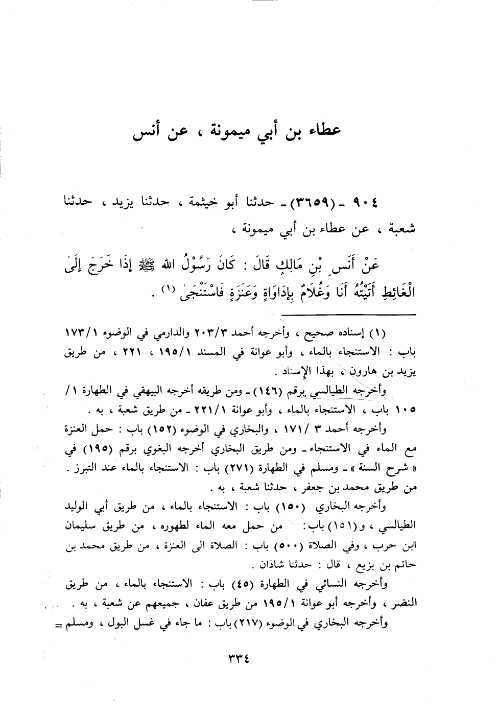 3659 - حَدَّثَنَا أَبُو خَيْثَمَةَ، حَدَّثَنَا يَزِيدُ، حَدَّثَنَا شُعْبَةُ، عَنْ عَطَاءِ بْنِ أَبِي مَيْمُونَةَ، عَنْ أَنَسِ بْنِ مَالِكٍ قَالَ: «كَانَ رَسُولُ اللَّهِ صَلَّى اللهُ عَلَيْهِ وَسَلَّمَ §إِذَا خَرَجَ إِلَى الْغَائِطِ أَتَيْتُهُ أَنَا وَغُلَامٌ بِإِدَاوَاةٍ وَعَنَزَةٍ فَاسْتَنْجَى» Kإسناده صحيح