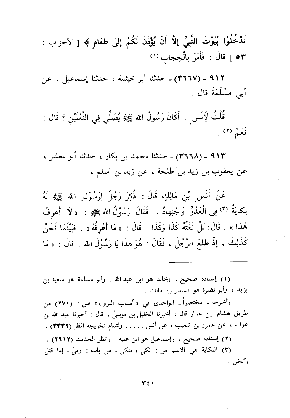 3667 - حَدَّثَنَا أَبُو خَيْثَمَةَ، حَدَّثَنَا إِسْمَاعِيلُ، عَنْ أَبِي مَسْلَمَةَ قَالَ: قُلْتُ لِأَنَسٍ: أَكَانَ رَسُولُ اللَّهِ صَلَّى اللهُ عَلَيْهِ وَسَلَّمَ §يُصَلِّي فِي النَّعْلَيْنِ؟ قَالَ: «نَعَمْ» Kإسناده صحيح