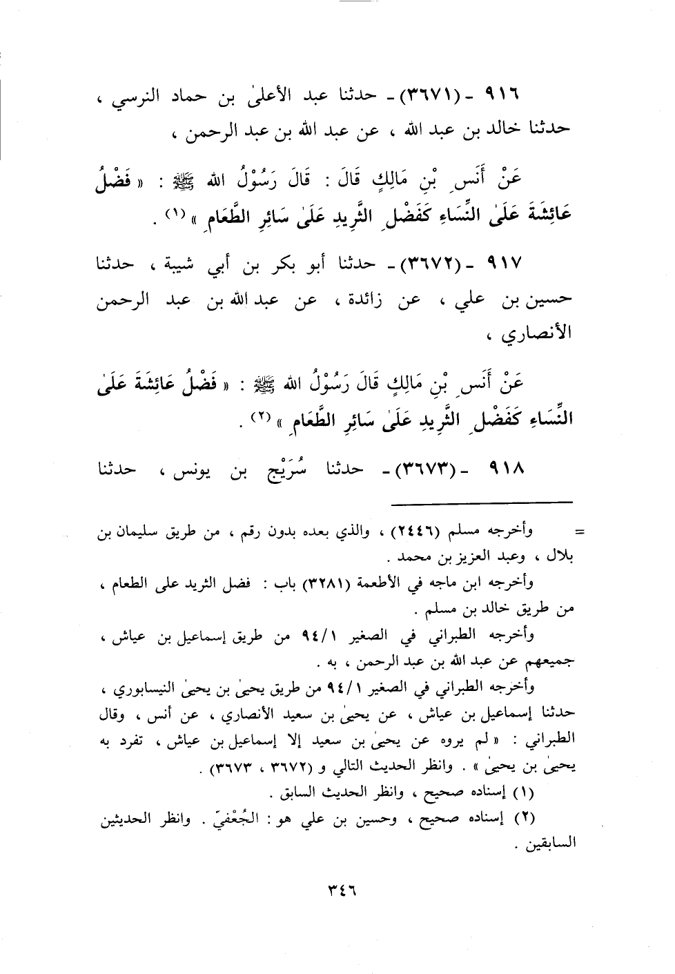 3673 - حَدَّثَنَا سُرَيْجُ بْنُ يُونُسَ، حَدَّثَنَا إِسْمَاعِيلُ بْنُ جَعْفَرٍ، عَنْ عَبْدِ اللَّهِ بْنِ عَبْدِ الرَّحْمَنِ، عَنْ أَنَسِ بْنِ مَالِكٍ، قَالَ رَسُولُ اللَّهِ صَلَّى اللهُ عَلَيْهِ وَسَلَّمَ: «§فَضْلُ عَائِشَةَ عَلَى النِّسَاءِ كَفَضْلِ الثَّرِيدِ عَلَى سَائِرِ الطَّعَامِ» Kإسناده صحيح