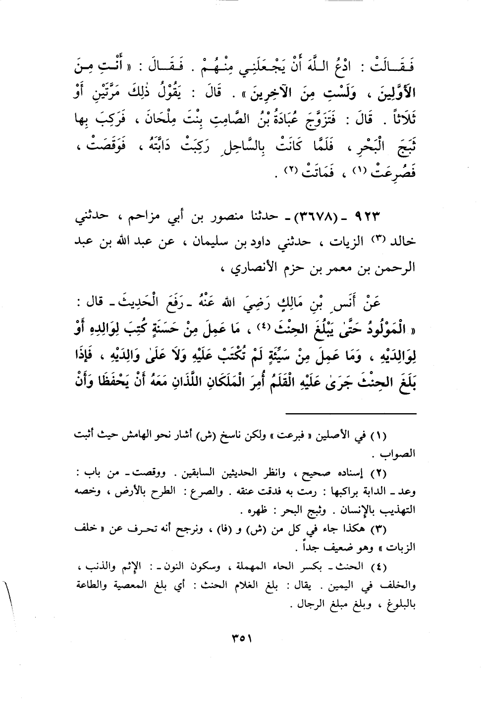 3678 - حَدَّثَنَا مَنْصُورُ بْنُ أَبِي مُزَاحِمٍ، حَدَّثَنِي خَالِدٌ الزَّيَّاتُ، حَدَّثَنِي دَاوُدُ بْنُ سُلَيْمَانَ، عَنْ عَبْدِ اللَّهِ بْنِ عَبْدِ الرَّحْمَنِ بْنِ مَعْمَرِ بْنِ حَزْمٍ الْأَنْصَارِيِّ، عَنْ أَنَسِ بْنِ مَالِكٍ رَضِيَ اللَّهُ عَنْهُ، رَفَعَ الْحَدِيثَ قَالَ: " §الْمَوْلُودُ حَتَّى يَبْلُغَ الْحِنْثَ مَا عَمِلَ مِنْ حَسَنَةٍ كُتِبَ لِوَالِدِهِ أَوْ لِوَالِدَيْهِ، وَمَا عَمِلَ مِنْ سَيِّئَةٍ لَمْ تُكْتَبْ عَلَيْهِ وَلَا عَلَى وَالِدَيْهِ، فَإِذَا بَلَغَ الْحِنْثَ جَرَى عَلَيْهِ الْقَلَمُ، أَمَرَ الْمَلَكَانِ اللَّذَانِ مَعَهُ أَنْ يَحْفَظَا وَأَنْ -[352]- يُشَدِّدَا، فَإِذَا بَلَغَ أَرْبَعِينَ سَنَةً فِي الْإِسْلَامِ أَمَّنَهُ اللَّهُ مِنَ الْبَلَايَا الثَّلَاثَةِ: الْجُنُونِ وَالْجُذَامِ وَالْبَرَصِ، فَإِذَا بَلَغَ الْخَمْسِينَ خَفَّفَ اللَّهُ مِنْ حِسَابِهِ، فَإِذَا بَلَغَ السِّتِّينَ رَزَقَهُ اللَّهُ الْإِنَابَةَ إِلَيْهِ بِمَا يُحِبُّ، فَإِذَا بَلَغَ السَّبْعِينَ أَحَبَّهُ أَهْلُ السَّمَاءِ، فَإِذَا بَلَغَ الثَّمَانِينَ كَتَبَ اللَّهُ لَهُ حَسَنَاتِهِ وَتَجَاوَزَ عَنْ سَيِّئَاتِهِ، فَإِذَا بَلَغَ التِّسْعِينَ غَفَرَ اللَّهُ لَهُ مَا تَقَدَّمَ مِنْ ذَنْبِهِ وَمَا تَأَخَّرَ، وَشَفَّعَهُ فِي أَهْلِ بَيْتِهِ، وَكَانَ أَسِيرَ اللَّهِ فِي أَرْضِهِ، فَإِذَا بَلَغَ أَرْذَلَ الْعُمُرِ لِكَيْ لَا يَعْلَمُ بَعْدَ عِلْمٍ شَيْئًا كَتَبَ اللَّهُ لَهُ مِثْلَ مَا كَانَ يَعْمَلُ فِي صِحَّتِهِ مِنَ الْخَيْرِ، فَإِذَا عَمِلَ سَيِّئَةً لَمْ تُكْتَبْ عَلَيْهِ "Kإسناده صحيح