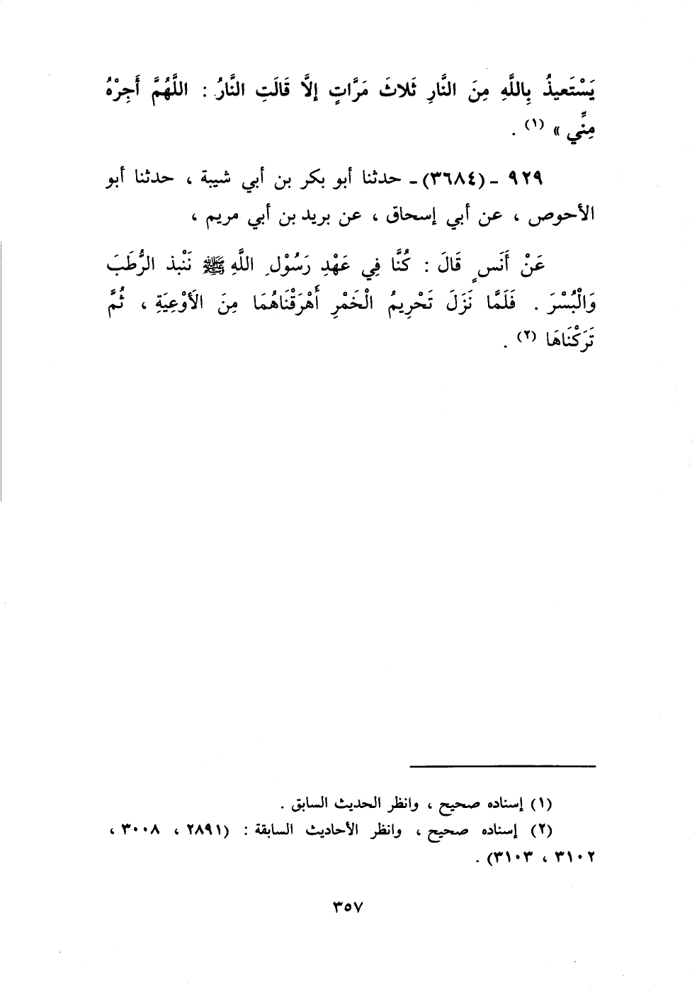 3684 - حَدَّثَنَا أَبُو بَكْرِ بْنُ أَبِي شَيْبَةَ، حَدَّثَنَا أَبُو الْأَحْوَصِ، عَنْ أَبِي إِسْحَاقَ، عَنْ بُرَيْدِ بْنِ أَبِي مَرْيَمَ، عَنْ أَنَسٍ قَالَ: «كُنَّا فِي عَهْدِ رَسُولِ اللَّهِ صَلَّى اللهُ عَلَيْهِ وَسَلَّمَ §نَنْبِذُ الرُّطَبَ وَالْبُسْرَ، فَلَمَّا نَزَلَ تَحْرِيمُ الْخَمْرِ أَهْرَقْنَاهَمَا مِنَ الْأَوْعِيَةِ ثُمَّ تَرَكْنَاهَا» Kإسناده صحيح