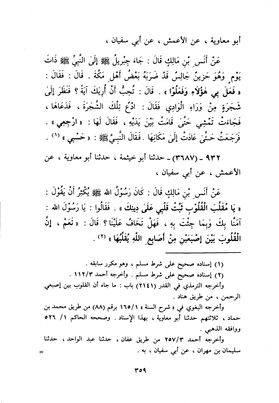 3687 - حَدَّثَنَا أَبُو خَيْثَمَةَ، حَدَّثَنَا أَبُو مُعَاوِيَةَ، عَنِ الْأَعْمَشِ، عَنْ أَبِي سُفْيَانَ، عَنْ أَنَسِ بْنِ مَالِكٍ قَالَ: كَانَ رَسُولُ اللَّهِ صَلَّى اللهُ عَلَيْهِ وَسَلَّمَ يُكْثِرُ أَنْ يَقُولَ: «§يَا مُقَلِّبَ الْقُلُوبِ ثَبِّتْ قَلْبِي عَلَى دِينَكَ»، فَقَالُوا: يَا رَسُولَ اللَّهِ، آمَنَّا بِكَ وَبِمَا جِئْتَ بِهِ، فَهَلْ تَخَافُ عَلَيْنَا؟ قَالَ: «نَعَمْ، إِنَّ الْقُلُوبَ بَيْنَ إِصْبَعَيْنِ مِنْ أَصَابِعِ اللَّهِ يُقَلِّبُهَا» Kإسناده صحيح على شرط مسلم