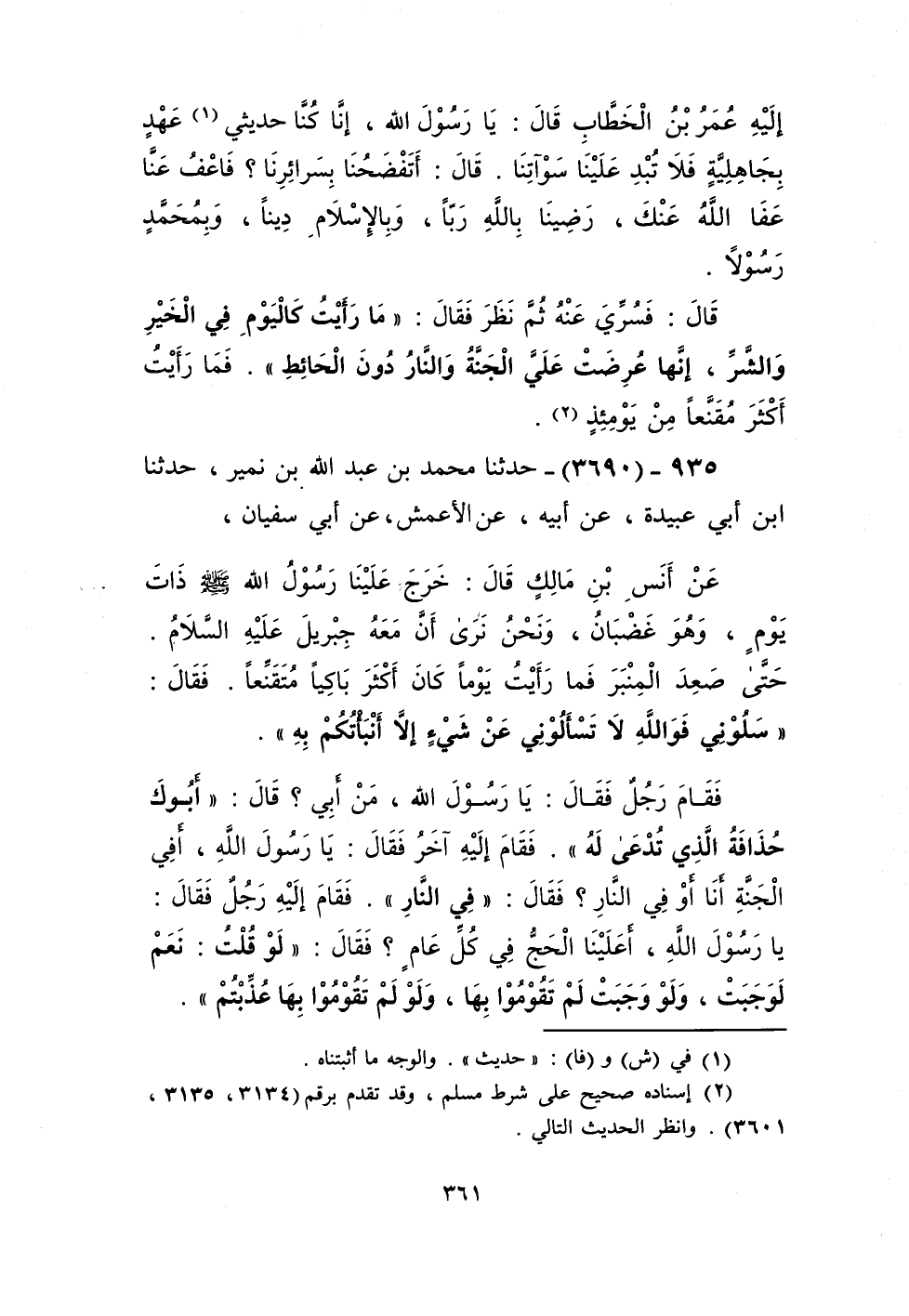 3690 - حَدَّثَنَا مُحَمَّدُ بْنُ عَبْدِ اللَّهِ بْنِ نُمَيْرٍ، حَدَّثَنَا ابْنُ أَبِي عُبَيْدَةَ، عَنْ أَبِيهِ، عَنِ الْأَعْمَشِ، عَنْ أَبِي سُفْيَانَ، عَنْ أَنَسِ بْنِ مَالِكٍ قَالَ: خَرَجَ عَلَيْنَا رَسُولُ اللَّهِ صَلَّى اللهُ عَلَيْهِ وَسَلَّمَ ذَاتَ يَوْمٍ وَهُوَ غَضْبَانُ، وَنَحْنُ نَرَى أَنَّ مَعَهُ جِبْرِيلَ عَلَيْهِ السَّلَامُ حَتَّى صَعِدَ الْمِنْبَرَ، فَمَا رَأَيْتُ يَوْمًا كَانَ أَكْثَرَ بَاكِيًا مُتَقَنِّعًا، فَقَالَ: «§سَلُونِي، فَوَاللَّهِ لَا تَسْأَلُونِي عَنْ شَيْءٍ إِلَّا أَنْبَأْتُكُمْ بِهِ»، فَقَامَ رَجُلٌ فَقَالَ: يَا رَسُولَ اللَّهِ، مَنْ أَبِي؟ قَالَ: «أَبُوكَ حُذَافَةُ الَّذِي تُدْعَى لَهُ»، فَقَامَ إِلَيْهِ آخَرُ فَقَالَ: يَا رَسُولَ اللَّهِ، أَفِي الْجَنَّةِ أَنَا أَوْ فِي النَّارِ؟ فَقَالَ: «فِي النَّارِ»، فَقَامَ إِلَيْهِ رَجُلٌ فَقَالَ: يَا رَسُولَ اللَّهِ، أَعَلَيْنَا الْحَجُّ فِي كُلِّ عَامٍ؟ فَقَالَ: " لَوْ قُلْتُ: نَعَمْ لَوَجَبَتْ، وَلَوْ وَجَبَتْ لَمْ تَقُومُوا بِهَا، وَلَوْ لَمْ تَقُومُوا بِهَا عُذِّبْتُمْ "، فَقَالَ عُمَرُ بْنُ الْخَطَّابِ رَضِيَ اللَّهُ عَنْهُ: رَضِينَا بِاللَّهِ رَبًّا وَبِالْإِسْلَامِ دِينًا وَبِمُحَمَّدٍ نَبِيًّا، وَلَا تَفْضَحْنَا بِسَرَائِرِنَا، وَاعْفُ عَنَّا عَفَا اللَّهُ عَنْكَ، قَالَ: فَسُرِّيَ عَنْهُ، ثُمَّ الْتَفَتَ نَحْو الْحَائِطِ فَقَالَ: «لَمْ أَرَ كَالْيَوْمِ فِي الْخَيْرِ وَالشَّرِّ، أُرِيتُ الْجَنَّةَ وَالنَّارَ وَرَاءَ هَذَا الْحَائِطِ» Kإسناده صحيح على شرط مسلم