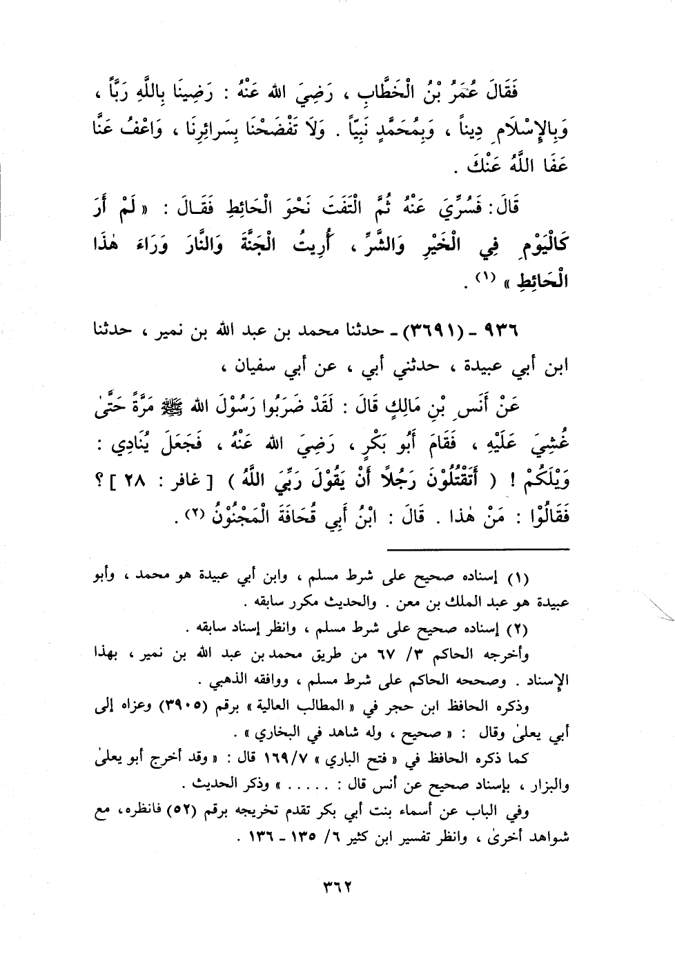 3691 - حَدَّثَنَا مُحَمَّدُ بْنُ عَبْدِ اللَّهِ بْنُ نُمَيْرٍ، حَدَّثَنَا ابْنُ أَبِي عُبَيْدَةَ، حَدَّثَنِي أَبِي، عَنْ أَبِي سُفْيَانَ، عَنْ أَنَسِ بْنِ مَالِكٍ قَالَ: §لَقَدْ ضَرَبُوا رَسُولَ اللَّهِ صَلَّى اللهُ عَلَيْهِ وَسَلَّمَ مَرَّةً حَتَّى غُشِيَ عَلَيْهِ، فَقَامَ أَبُو بَكْرٍ رَضِيَ اللَّهُ عَنْهُ فَجَعَلَ يُنَادِي: «وَيْلَكُمْ» {أَتَقْتُلُونَ رَجُلًا أَنْ يَقُولَ رَبِّيَ اللَّهُ} [غافر: 28]؟ فَقَالُوا: مَنْ هَذَا؟ قَالَ: ابْنُ أَبِي قُحَافَةَ الْمَجْنُونُKإسناده صحيح على شرط مسلم