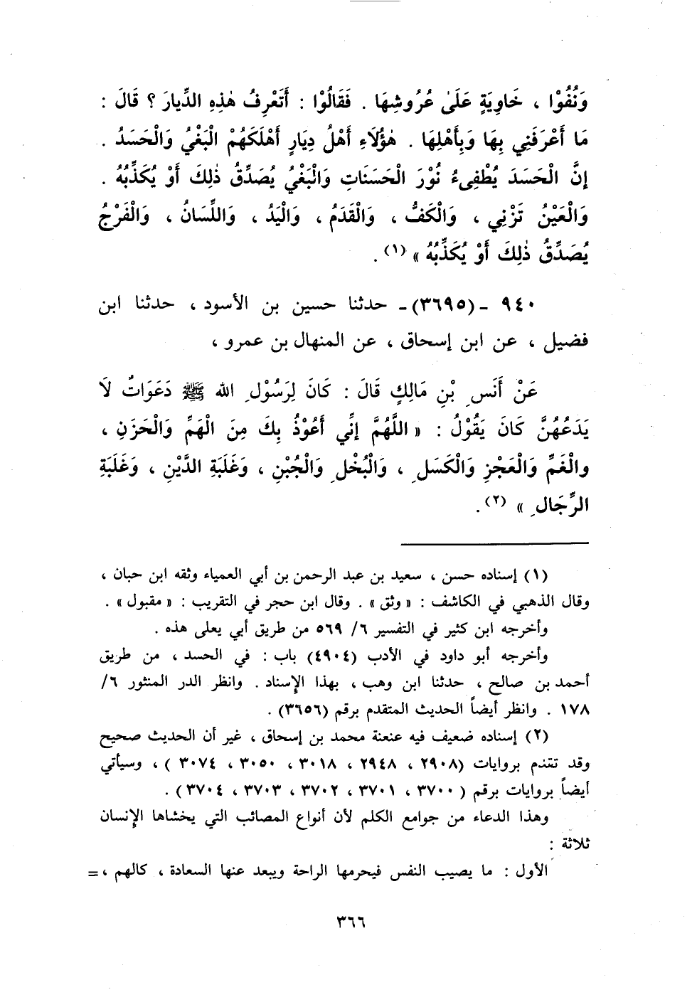 3695 - حَدَّثَنَا حُسَيْنُ بْنُ الْأَسْوَدِ، حَدَّثَنَا ابْنُ فُضَيْلٍ، عَنِ ابْنِ إِسْحَاقَ، عَنِ الْمِنْهَالِ بْنِ عَمْرٍو، عَنْ أَنَسِ بْنِ مَالِكٍ قَالَ: كَانَ لِرَسُولِ اللَّهِ صَلَّى اللهُ عَلَيْهِ وَسَلَّمَ دَعَوَاتٌ لَا يَدَعَهُنَّ، كَانَ يَقُولُ: «§اللَّهُمَّ إِنِّي أَعُوذُ بِكَ مِنَ الْهَمِّ وَالْحَزَنِ، وَالْغَمِّ وَالْعَجْزِ وَالْكَسَلِ، وَالْبُخْلِ وَالْجُبْنِ، وَغَلَبَةِ الدَّيْنِ، وَغَلَبَةِ الرِّجَالِ» Kإسناده ضعيف