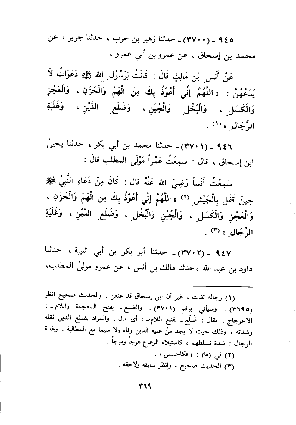 3700 - حَدَّثَنَا زُهَيْرُ بْنُ حَرْبٍ، حَدَّثَنَا جَرِيرٌ، عَنْ مُحَمَّدِ بْنِ إِسْحَاقَ، عَنْ عَمْرِو بْنِ أَبِي عَمْرٍو، عَنْ أَنَسِ بْنِ مَالِكٍ قَالَ: كَانَتْ لِرَسُولِ اللَّهِ صَلَّى اللهُ عَلَيْهِ وَسَلَّمَ دَعَوَاتٌ لَا يَدَعُهُنَّ: «§اللَّهُمَّ إِنِّي أَعُوذُ بِكَ مِنَ الْهَمِّ وَالْحَزَنِ، وَالْعَجْزِ وَالْكَسَلِ، وَالْبُخْلِ وَالْجُبْنِ، وَضَلَعِ الدَّيْنِ، وَغَلَبَةِ الرِّجَالِ» Kرجاله ثقات والحديث صحيح