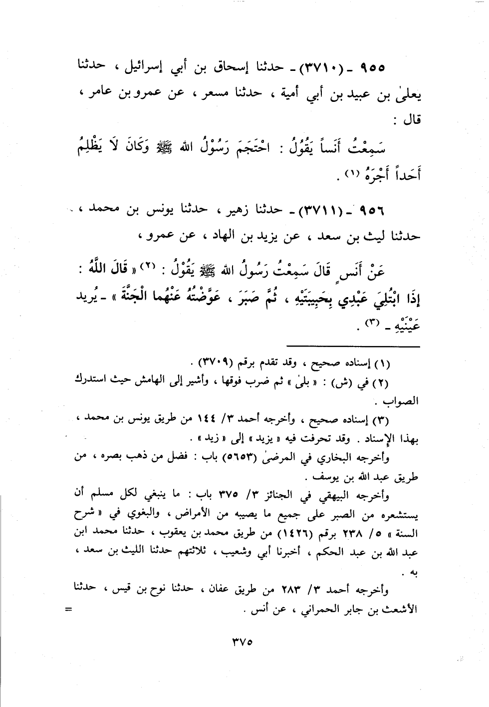 3711 - حَدَّثَنَا زُهَيْرٌ، حَدَّثَنَا يُونُسُ بْنُ مُحَمَّدٍ، حَدَّثَنَا لَيْثُ بْنُ سَعْدٍ، عَنْ يَزِيدَ بْنِ الْهَادِ، عَنْ عَمْرٍو، عَنْ أَنَسٍ قَالَ: سَمِعْتُ رَسُولَ اللَّهِ صَلَّى اللهُ عَلَيْهِ وَسَلَّمَ يَقُولُ: " قَالَ اللَّهُ: §إِذَا ابْتُلِيَ عَبْدِي بِحَبِيبَتَيْهِ ثُمَّ صَبَرَ عَوَّضْتُهُ عَنْهُمَا الْجَنَّةَ " يُرِيدُ عَيْنَيْهِKإسناده صحيح