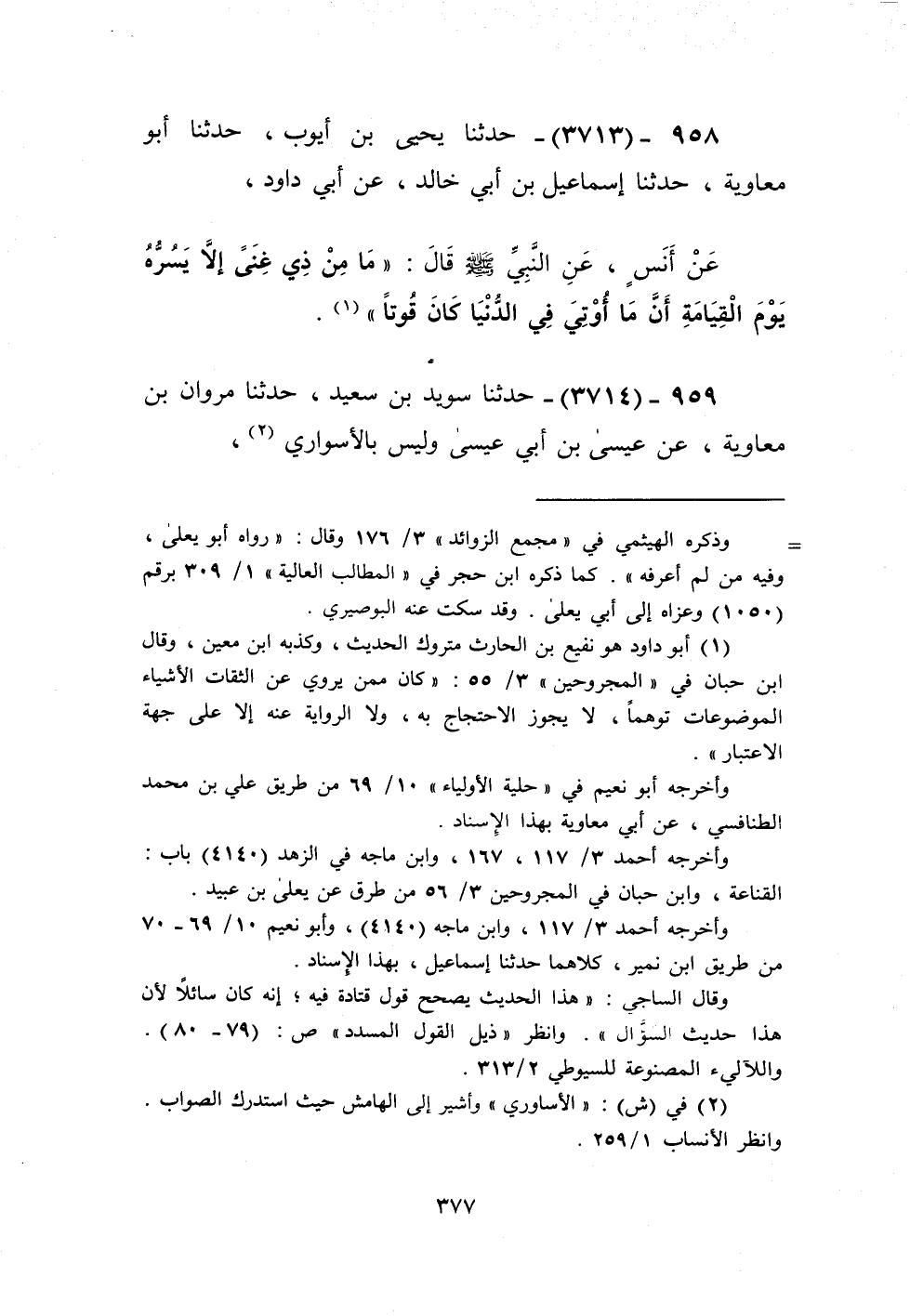 3713 - حَدَّثَنَا يَحْيَى بْنُ أَيُّوبَ، حَدَّثَنَا أَبُو مُعَاوِيَةَ، حَدَّثَنَا إِسْمَاعِيلُ بْنُ أَبِي خَالِدٍ، عَنْ أَبِي دَاوُدَ، عَنْ أَنَسٍ، عَنِ النَّبِيِّ صَلَّى اللهُ عَلَيْهِ وَسَلَّمَ قَالَ: «§مَا مِنْ ذِي غِنًى إِلَّا يَسُرُّهُ يَوْمَ الْقِيَامَةِ أَنَّ مَا أُوتِي فِي الدُّنْيَا كَانَ قُوتًا»