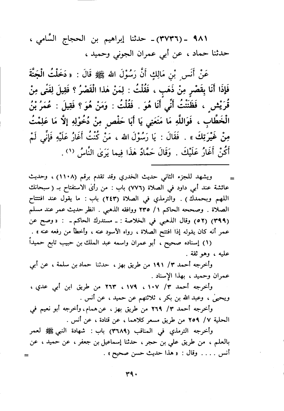 3736 - حَدَّثَنَا إِبْرَاهِيمُ بْنُ الْحَجَّاجِ السَّامِيُّ، حَدَّثَنَا حَمَّادٌ، عَنْ أَبِي عِمْرَانَ الْجَوْنِيِّ، وَحُمَيْدٍ، عَنْ أَنَسِ بْنِ مَالِكٍ، أَنَّ رَسُولَ اللَّهِ صَلَّى اللهُ عَلَيْهِ وَسَلَّمَ قَالَ: " §دَخَلْتُ الْجَنَّةَ، فَإِذَا أَنَا بِقَصْرٍ مِنْ ذَهَبٍ، فَقُلْتُ: لِمَنْ هَذَا الْقَصْرُ؟ فَقِيلَ: لِفَتًى مِنْ قُرَيْشٍ، فَظَنَنْتُ أَنِّي أَنَا هُوَ فَقُلْتُ: وَمَنْ هُوَ؟ فَقِيلَ: عُمَرُ بْنُ الْخَطَّابِ، فَوَاللَّهِ مَا مَنَعَنِي يَا أَبَا حَفْصٍ مِنْ دُخُولِهِ إِلَّا مَا عَلِمْتُ مِنْ غَيْرَتَكَ "، فَقَالَ: يَا رَسُولَ اللَّهِ، مَنْ كُنْتُ أَغَارُ عَلَيْهِ فَإِنِّي لَمْ أَكُنْ أَغَارُ عَلَيْكَ، وَقَالَ حَمَّادٌ: هَذَا فِيمَا يَرَى النَّاسُKإسناده صحيح