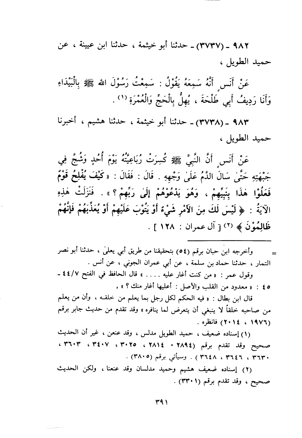 3738 - حَدَّثَنَا أَبُو خَيْثَمَةَ، حَدَّثَنَا هُشَيْمٌ، أَخْبَرَنَا حُمَيْدٌ الطَّوِيلُ، عَنْ أَنَسٍ، أَنَّ النَّبِيَّ صَلَّى اللهُ عَلَيْهِ وَسَلَّمَ كُسِرَتْ رَبَاعِيَّتُهُ يَوْمَ أُحُدٍ، وَشُجَّ فِي جَبْهَتِهِ حَتَّى سَالَ الدَّمُ عَلَى وَجْهِهِ. قَالَ: فَقَالَ: «§كَيْفَ يُفْلِحُ قَوْمٌ فَعَلُوا هَذَا بِنَبِيِّهِمْ وَهُوَ يَدْعُوهُمْ إِلَى رَبِّهِمْ؟» فَنَزَلَتْ هَذِهِ الْآيَةُ: {لَيْسَ لَكَ مِنَ الْأَمْرِ شَيْءٌ أَوْ يَتُوبَ عَلَيْهِمْ أَوْ يُعَذِّبَهُمْ فَإِنَّهُمْ ظَالِمُونَ} [آل عمران: 128] Kإسناده ضعيف