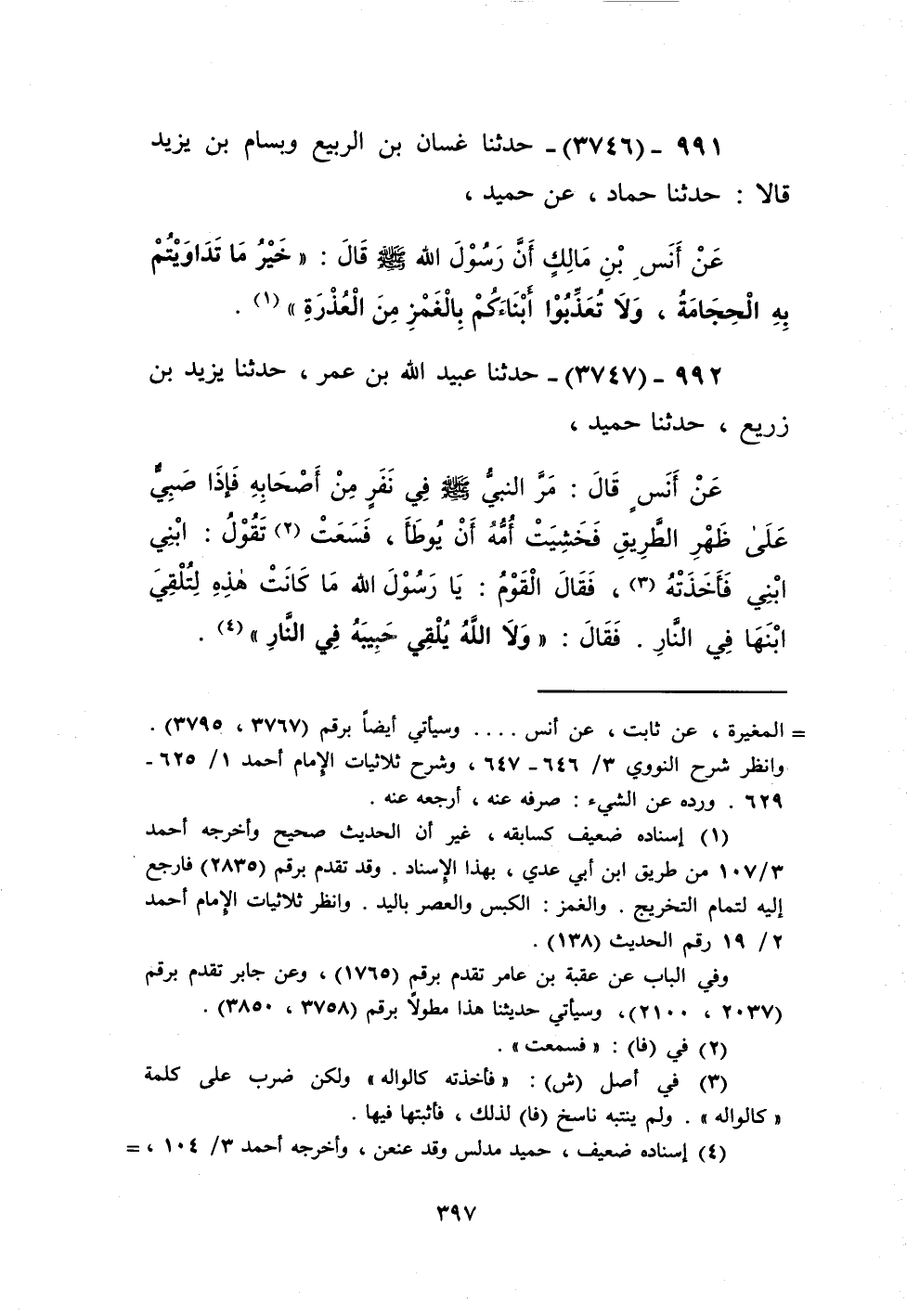 3746 - حَدَّثَنَا غَسَّانُ بْنُ الرَّبِيعِ، وَبَسَّامُ بْنُ يَزِيدَ قَالَا: حَدَّثَنَا حَمَّادٌ، عَنْ حُمَيْدٍ، عَنْ أَنَسِ بْنِ مَالِكٍ، أَنَّ رَسُولَ اللَّهِ صَلَّى اللهُ عَلَيْهِ وَسَلَّمَ قَالَ: «§خَيْرُ مَا تَدَاوَيْتُمْ بِهِ الْحِجَامَةُ، وَلَا تُعَذِّبُوا أَبْنَاءَكُمْ بِالْغَمْزِ مِنَ الْعُذْرَةَ» Kإسناده ضعيف غير أن الحديث صحيح