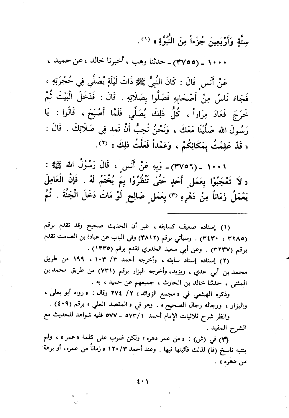 3755 - حَدَّثَنَا وَهْبٌ، أَخْبَرَنَا خَالِدٌ، عَنْ حُمَيْدٍ، عَنْ أَنَسٍ قَالَ: كَانَ النَّبِيُّ صَلَّى اللهُ عَلَيْهِ وَسَلَّمَ ذَاتَ لَيْلَةٍ يُصَلِّي فِي حُجْرَتِهِ فَجَاءَ نَاسٌ مِنْ أَصْحَابِهِ فَصَلَّوْا بِصَلَاتِهِ، قَالَ: فَدَخَلَ الْبَيْتَ ثُمَّ خَرَجَ فَعَادَ مِرَارًا كُلُّ ذَلِكَ يُصَلِّي، فَلَمَّا أَصْبَحَ قَالُوا: يَا رَسُولَ اللَّهِ، صَلَّيْنَا مَعَكَ وَنَحْنُ نُحِبُّ أَنْ تَمُدَّ فِي صَلَاتِكَ، قَالَ: «§قَدْ عَلِمْتُ بِمَكَانِكُمْ، وَعَمْدًا فَعَلْتُ ذَلِكَ» Kإسناده ضعيف
