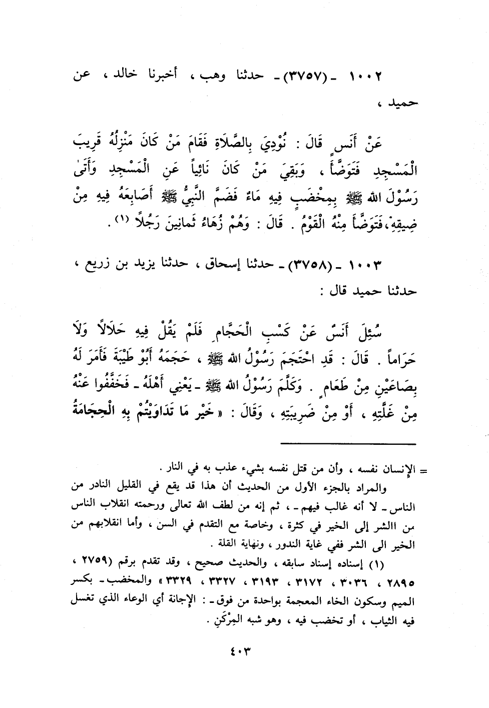3757 - حَدَّثَنَا وَهْبٌ، أَخْبَرَنَا خَالِدٌ، عَنْ حُمَيْدٍ، عَنْ أَنَسٍ قَالَ: نُودِيَ بِالصَّلَاةِ فَقَامَ مَنْ كَانَ مَنْزِلُهُ قَرِيبَ الْمَسْجِدِ فَتَوَضَّأَ وَبَقِيَ مَنْ كَانَ نَائِيًا عَنِ الْمَسْجِدِ، «وَأَتَى رَسُولُ اللَّهِ صَلَّى اللهُ عَلَيْهِ وَسَلَّمَ بِمِخْضَبٍ فِيهِ مَاءٌ §فَضَمَّ النَّبِيُّ صَلَّى اللهُ عَلَيْهِ وَسَلَّمَ أَصَابِعَهُ فِيهِ مِنْ ضِيقِهِ فَتَوَضَّأَ مِنْهُ الْقَوْمُ»، قَالَ: وَهُمْ زُهَاءَ ثَمَانِينَ رَجُلًاKإسناده ضعيف والحديث صحيح