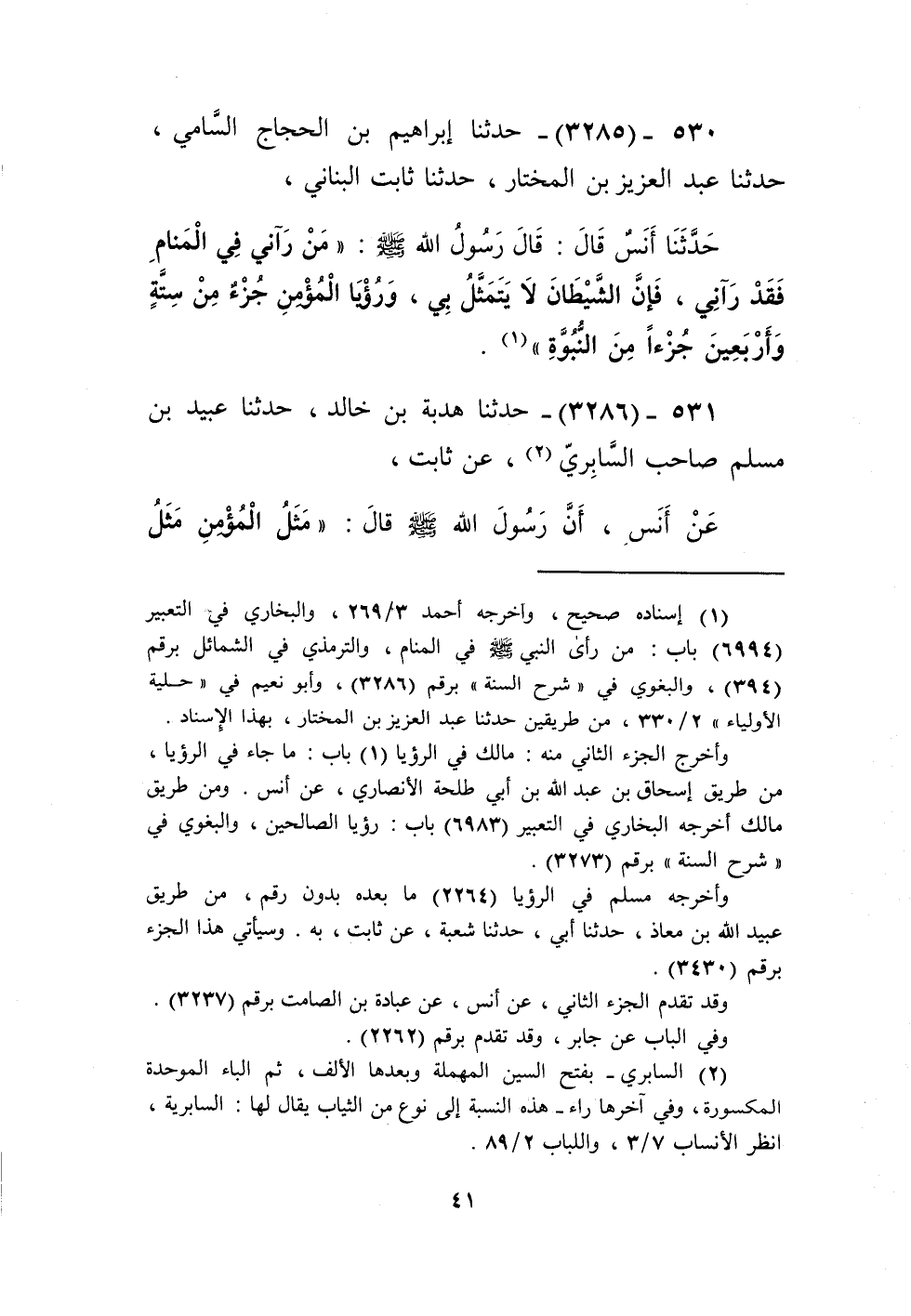3285 - حَدَّثَنَا إِبْرَاهِيمُ بْنُ الْحَجَّاجِ السَّامِيُّ، حَدَّثَنَا عَبْدُ الْعَزِيزِ بْنُ الْمُخْتَارِ، حَدَّثَنَا ثَابِتٌ الْبُنَانِيُّ، حَدَّثَنَا أَنَسٌ، قَالَ: قَالَ رَسُولُ اللَّهِ صَلَّى اللهُ عَلَيْهِ وَسَلَّمَ: «§مَنْ رَآنِي فِي الْمَنَامِ فَقَدْ رَآنِي، فَإِنَّ الشَّيْطَانَ لَا يَتَمَثَّلُ بِي، وَرُؤْيَا الْمُؤْمِنِ جُزْءٌ مِنْ سِتَّةٍ وَأَرْبَعِينَ جُزْءًا مِنَ النُّبُوَّةِ» Kإسناده صحيح