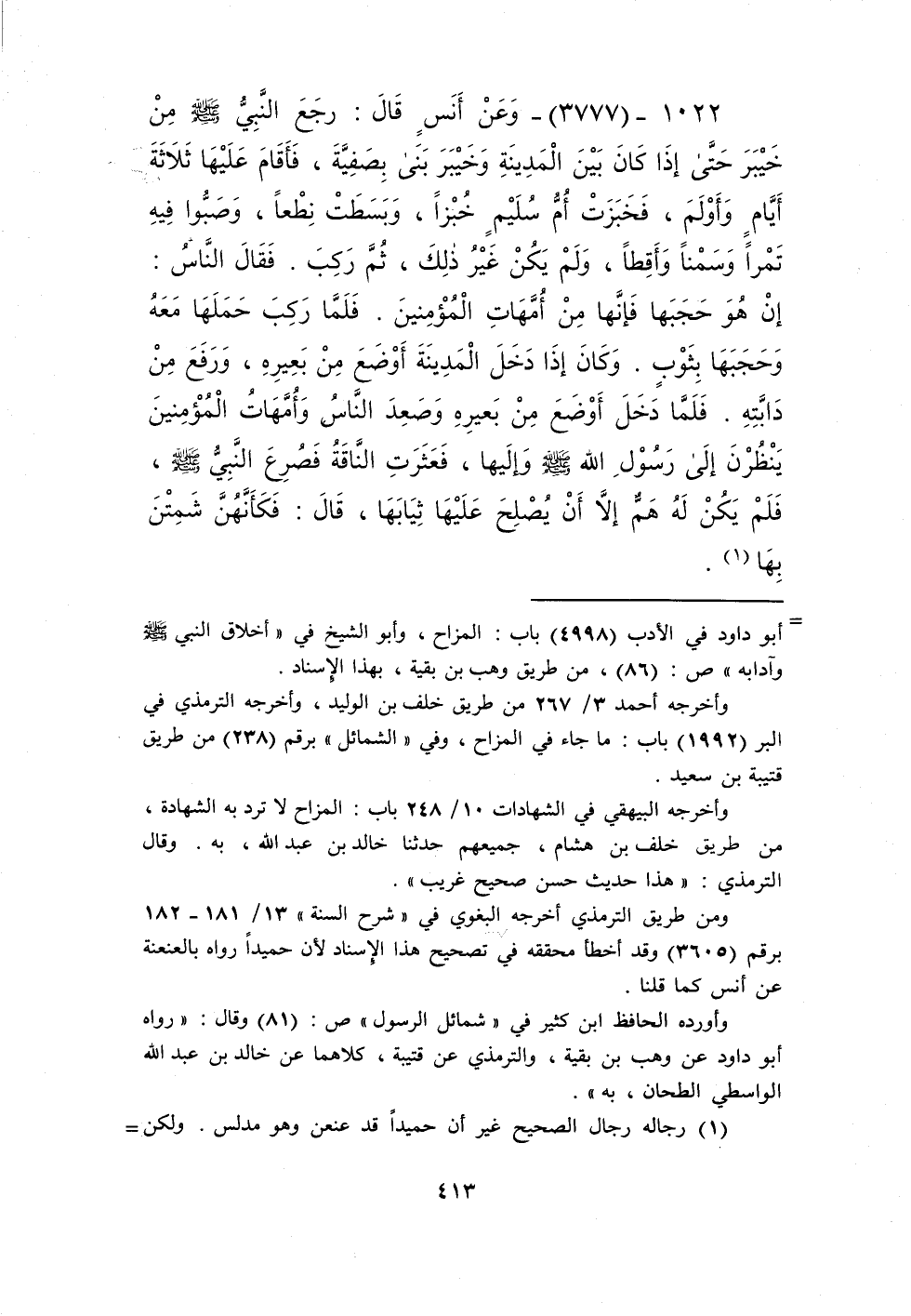 3777 - وَعَنْ أَنَسٍ قَالَ: «رَجَعَ النَّبِيُّ صَلَّى اللهُ عَلَيْهِ وَسَلَّمَ مِنْ خَيْبَرَ إِذَا كَانَ بَيْنَ الْمَدِينَةِ وَخَيْبَرَ §بَنَى بِصَفِيَّةَ، فَأَقَامَ عَلَيْهَا ثَلَاثَةَ أَيَّامٍ، وَأَوْلَمَ»، فَخَبَزَتْ أُمُّ سُلَيْمٍ خُبْزًا، وَبَسَطَتْ نِطَعًا، وَصَبُّوا فِيهِ تَمْرًا وَسَمْنًا وَأَقِطًا، وَلَمْ يَكُنْ غَيْرُ ذَلِكَ، ثُمَّ رَكِبَ، فَقَالَ النَّاسُ: إِنْ هُوَ حَجَبَهَا فَإِنَّهَا مِنْ أُمَّهَاتِ الْمُؤْمِنِينَ، «فَلَمَّا رَكِبَ حَمَلَهَا مَعَهُ وَحَجَبَهَا بِثَوْبٍ»، وَكَانَ إِذَا دَخَلَ الْمَدِينَةَ أَوْضَعَ مِنْ بَعِيرِهِ وَرَفَعَ مِنْ دَابَّتِهِ، «فَلَمَّا دَخَلَ أَوْضَعَ مِنْ بَعِيرِهِ»، وَصَعِدَ النَّاسُ، وَأُمَّهَاتُ الْمُؤْمِنِينَ يَنْظُرْنَ إِلَى رَسُولِ اللَّهِ صَلَّى اللهُ عَلَيْهِ وَسَلَّمَ وَإِلَيْهَا، فَعَثَرَتِ النَّاقَةُ «فَصُرِعَ النَّبِيُّ صَلَّى اللهُ عَلَيْهِ وَسَلَّمَ، فَلَمْ يَكُنْ لَهُ هُمٌّ إِلَّا أَنْ يُصْلِحَ عَلَيْهَا ثِيَابَهَا»، قَالَ: فَكَأَنَّهُنَّ شَمَتْنَ بِهَاKرجاله رجال الصحيح