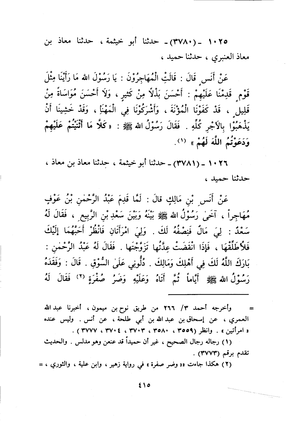 3780 - حَدَّثَنَا أَبُو خَيْثَمَةَ، حَدَّثَنَا مُعَاذُ بْنُ مُعَاذٍ الْعَنْبَرِيُّ، حَدَّثَنَا حُمَيْدٌ، عَنْ أَنَسٍ قَالَ: قَالَتِ الْمُهَاجِرُونَ: يَا رَسُولَ اللَّهِ، مَا رَأَيْنَا مِثْلَ قَوْمٍ قَدِمْنَا عَلَيْهِمْ أَحْسَنَ بَذْلًا مِنْ كَثِيرٍ، وَلَا أَحْسَنَ مُوَاسَاةً مِنْ قَلِيلٍ، قَدْ كَفَوْنَا الْمُؤْنَةَ، وَأَشْرَكُونَا فِي الْمَهْنَأِ، وَقَدْ خَشِينَا أَنْ يَذْهَبُوا بِالْأَجْرِ كُلِّهِ، فَقَالَ رَسُولُ اللَّهِ صَلَّى اللهُ عَلَيْهِ وَسَلَّمَ: «كَلَّا، §مَا أَثْنَيْتُمْ عَلَيْهِمْ، وَدَعَوْتُمُ اللَّهَ لَهُمْ» Kرجاله رجال الصحيح
