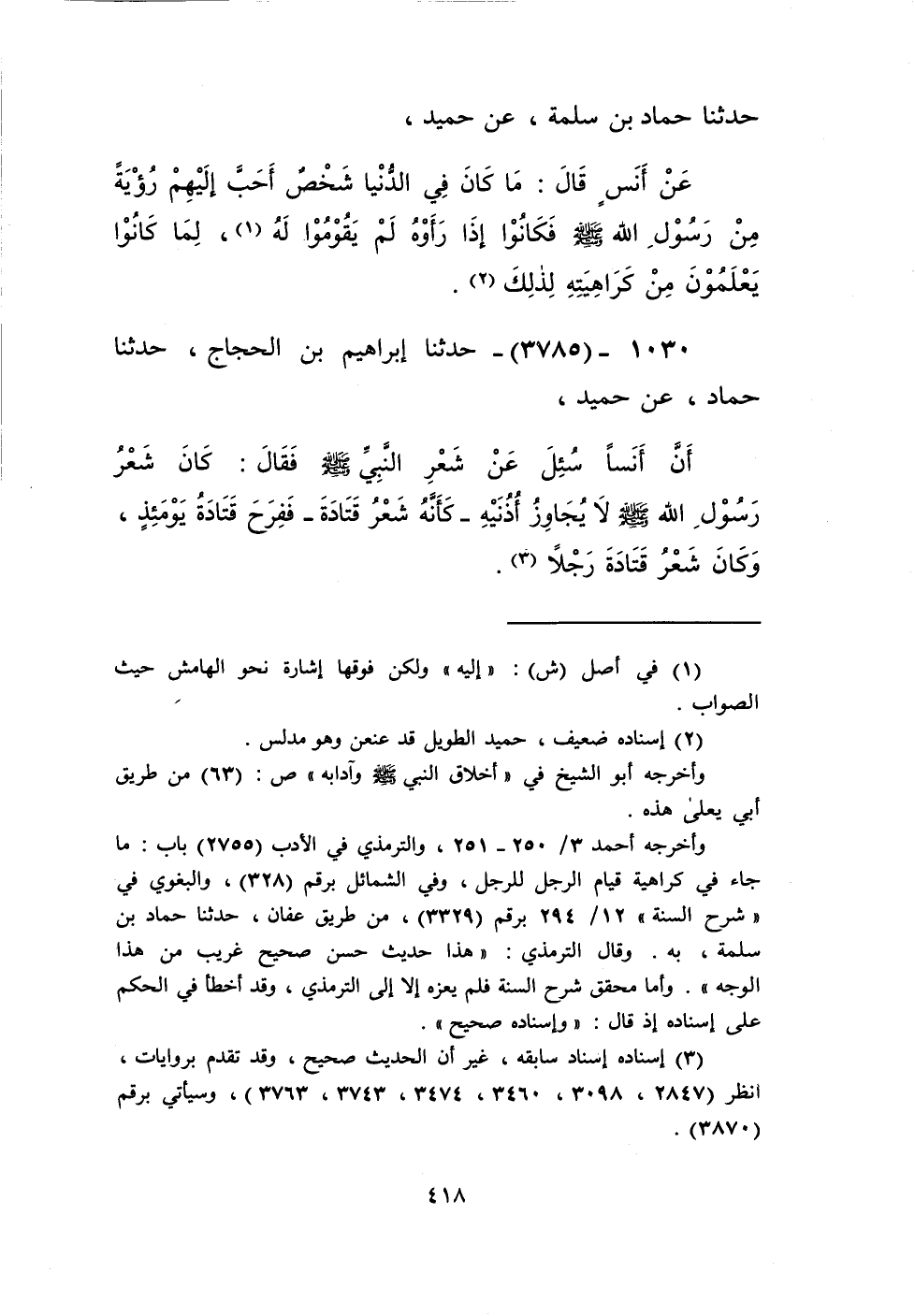 3785 - حَدَّثَنَا إِبْرَاهِيمُ بْنُ الْحَجَّاجِ، حَدَّثَنَا حَمَّادٌ، عَنْ حُمَيْدٍ، أَنَّ أَنَسًا سُئِلَ عَنْ شَعَرِ النَّبِيِّ صَلَّى اللهُ عَلَيْهِ وَسَلَّمَ فَقَالَ: «§كَانَ شَعَرُ رَسُولِ اللَّهِ صَلَّى اللهُ عَلَيْهِ وَسَلَّمَ لَا يُجَاوِزُ أُذُنَيْهِ»، كَأَنَّهُ شَعَرَ قَتَادَةَ، فَفَرِحَ قَتَادَةُ يَوْمَئِذٍ، وَكَانَ شَعَرُ قَتَادَةَ رَجِلًاKإسناده ضعيف غير أن الحديث صحيح