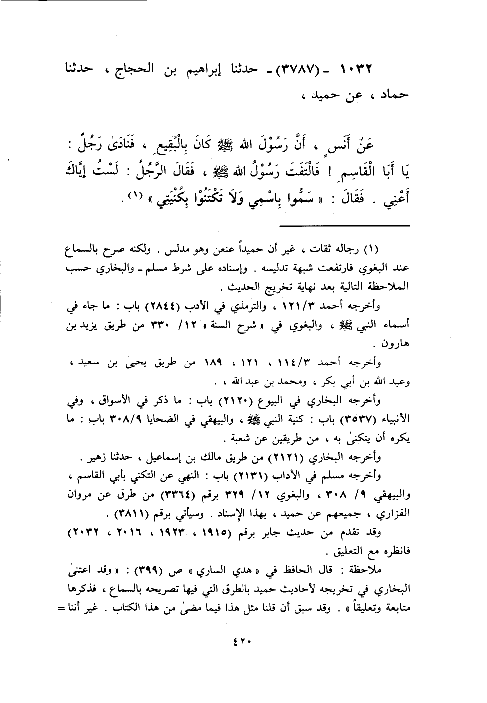 3787 - حَدَّثَنَا إِبْرَاهِيمُ بْنُ الْحَجَّاجِ، حَدَّثَنَا حَمَّادٌ، عَنْ حُمَيْدٍ، عَنْ أَنَسٍ، أَنَّ رَسُولَ اللَّهِ صَلَّى اللهُ عَلَيْهِ وَسَلَّمَ كَانَ بِالْبَقِيعِ فَنَادَى رَجُلٌ: يَا أَبَا الْقَاسِمِ، فَالْتَفَتَ رَسُولُ اللَّهِ صَلَّى اللهُ عَلَيْهِ وَسَلَّمَ فَقَالَ الرَّجُلُ: لَسْتُ إِيَّاكَ أَعِنِّي، فَقَالَ: «§سَمُّوا بِاسْمِي وَلَا تَكْتَنُوا بِكُنْيَتِي» Kإسناده على شرط مسلم والبخاري