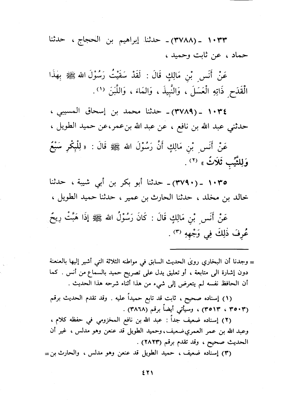 3788 - حَدَّثَنَا إِبْرَاهِيمُ بْنُ الْحَجَّاجِ، حَدَّثَنَا حَمَّادٌ، عَنْ ثَابِتٍ، وَحُمَيْدٍ، عَنْ أَنَسِ بْنِ مَالِكٍ قَالَ: «لَقَدْ §سَقَيْتُ رَسُولَ اللَّهِ صَلَّى اللهُ عَلَيْهِ وَسَلَّمَ بِهَذَا الْقَدَحِ ذَاتِهِ الْعَسَلَ وَالنَّبِيذَ وَالْمَاءَ وَاللَّبَنَ» Kإسناده صحيح