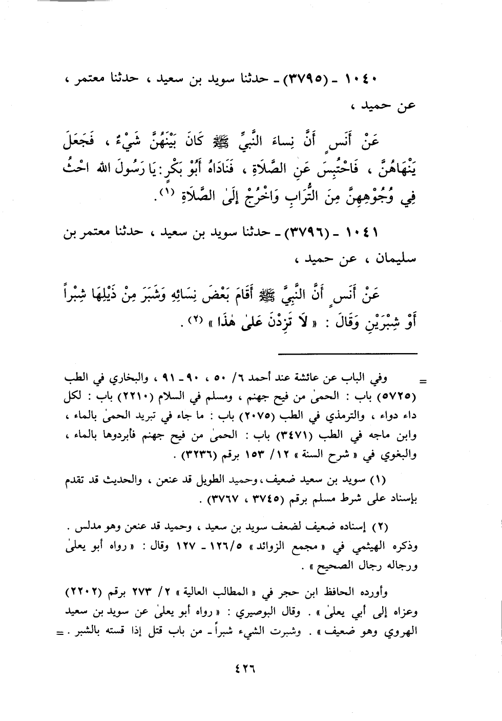 3796 - حَدَّثَنَا سُوَيْدُ بْنُ سَعِيدٍ، حَدَّثَنَا مُعْتَمِرُ بْنُ سُلَيْمَانَ، عَنْ حُمَيْدٍ، عَنْ أَنَسٍ، أَنَّ النَّبِيَّ صَلَّى اللهُ عَلَيْهِ وَسَلَّمَ أَقَامَ بَعْضَ نِسَائِهِ وَشَبَرَ مِنْ ذَيْلِهَا - شِبْرًا أَوْ شِبْرَيْنِ - وَقَالَ: «§لَا تَزِدْنَ عَلَى هَذَا» Kإسناده ضعيف