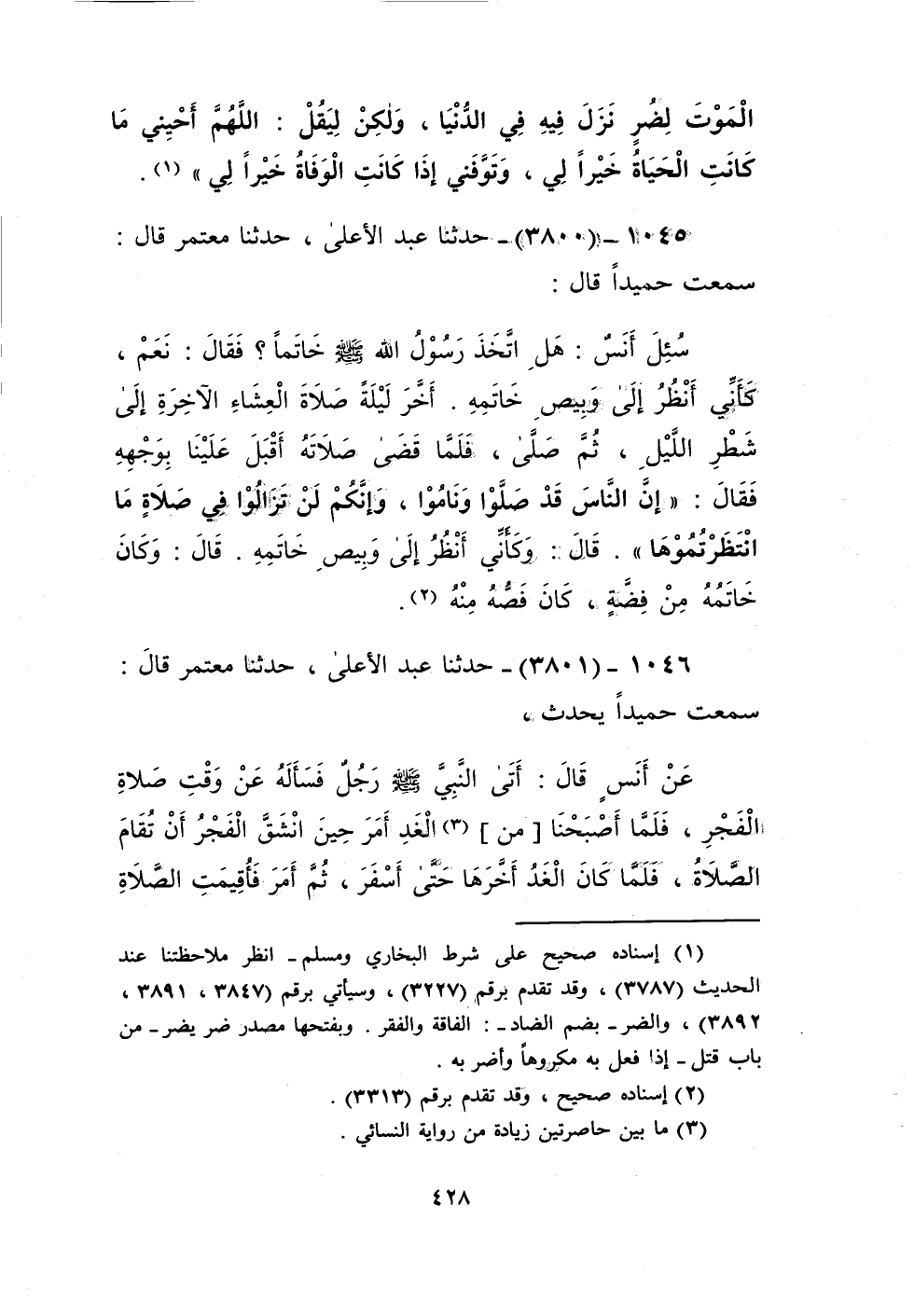 3800 - حَدَّثَنَا عَبْدُ الْأَعْلَى، حَدَّثَنَا مُعْتَمِرٌ قَالَ: سَمِعْتُ حُمَيْدًا قَالَ: سُئِلَ أَنَسٌ: هَلِ اتَّخَذَ رَسُولُ اللَّهِ صَلَّى اللهُ عَلَيْهِ وَسَلَّمَ خَاتَمًا؟ فَقَالَ: نَعَمْ، كَأَنِّي أَنْظُرُ إِلَى وَبِيصِ خَاتَمِهِ، أَخَّرَ لَيْلَةً صَلَاةَ الْعِشَاءِ الْآخِرَةِ إِلَى شَطْرِ اللَّيْلِ، ثُمَّ صَلَّى، فَلَمَّا قَضَى صَلَاتَهُ أَقْبَلَ عَلَيْنَا بِوَجْهِهِ فَقَالَ: «إِنَّ §النَّاسَ قَدْ صَلَّوْا وَنَامُوا، وَإِنَّكُمْ لَمْ تَزَالُوا فِي صَلَاةٍ مَا انْتَظَرْتُمُوهَا»، قَالَ: وَكَأَنِّي أَنْظُرُ إِلَى وَبِيصِ خَاتَمِهِ، قَالَ: وَكَانَ خَاتَمُهُ مِنْ فِضَّةٍ، كَانَ فَصُّهُ مِنْهُKإسناده صحيح