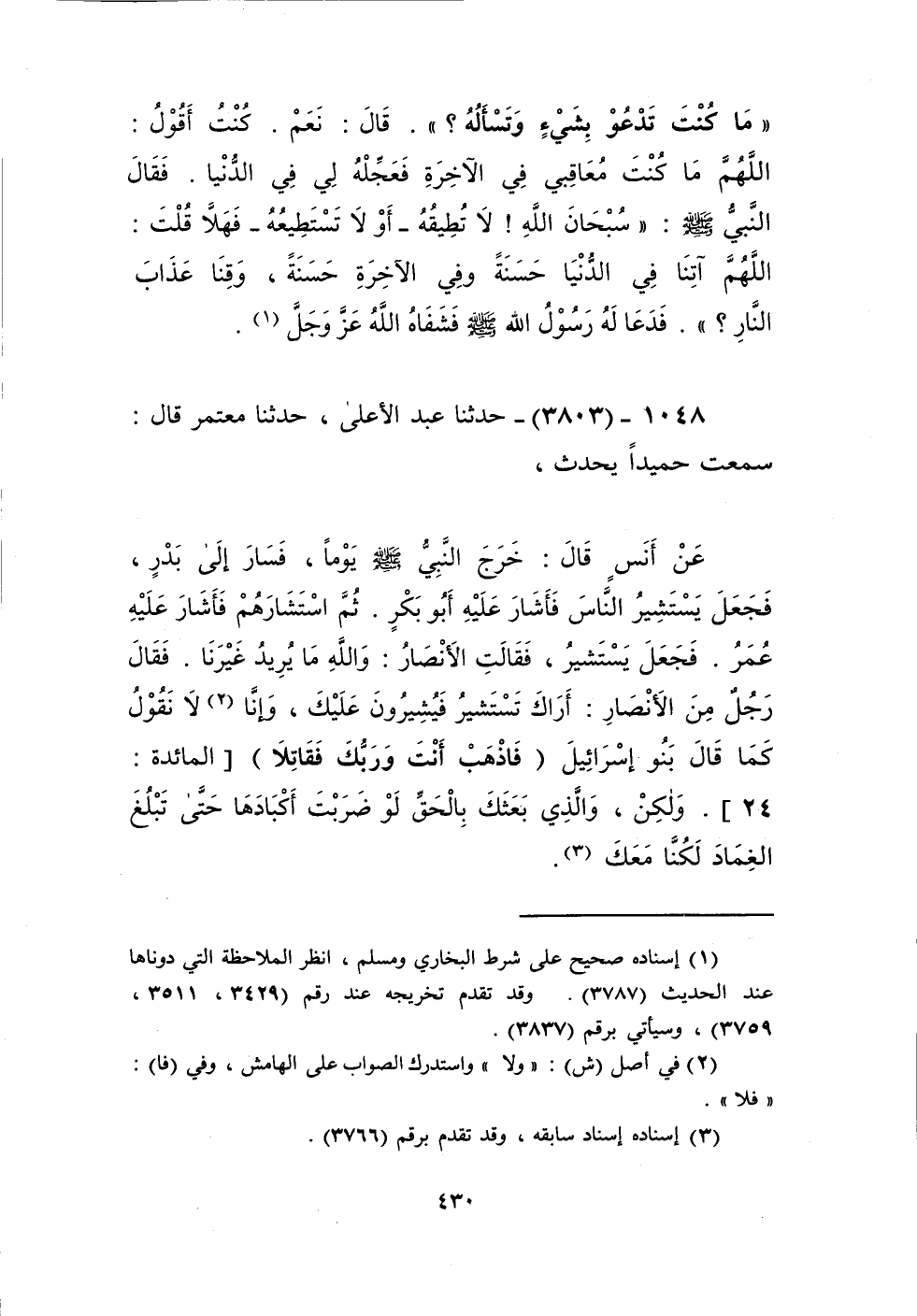 3803 - حَدَّثَنَا عَبْدُ الْأَعْلَى، حَدَّثَنَا مُعْتَمِرٌ قَالَ: سَمِعْتُ حُمَيْدًا يُحَدِّثُ، عَنْ أَنَسٍ قَالَ: خَرَجَ النَّبِيُّ صَلَّى اللهُ عَلَيْهِ وَسَلَّمَ يَوْمًا فَسَارَ إِلَى بَدْرٍ «§فَجَعَلَ يَسْتَشِيرُ النَّاسَ»، فَأَشَارَ عَلَيْهِ أَبُو بَكْرٍ، «ثُمَّ اسْتَشَارَهُمْ»، فَأَشَارَ عَلَيْهِ عُمَرُ، «فَجَعَلَ يَسْتَشِيرُ»، فَقَالَتِ الْأَنْصَارُ: وَاللَّهِ مَا يُرِيدُ غَيْرَنَا، فَقَالَ رَجُلٌ مِنَ الْأَنْصَارِ: أَرَاكَ تَسْتَشِيرُ فَيُشِيرُونَ عَلَيْكَ، وَإِنَّا لَا نَقُولُ كَمَا قَالَ بَنُو إِسْرَائِيلَ: {فَاذْهَبْ أَنْتَ وَرَبُّكَ فَقَاتِلَا} [المائدة: 24]، وَلَكِنْ وَالَّذِي بَعَثَكَ بِالْحَقِّ لَوْ ضَرَبْتَ أَكْبَادَهَا حَتَّى تَبْلُغَ الْغِمَادِ لَكِنَّا مَعَكَKإسناده صحيح على شرط البخاري ومسلم