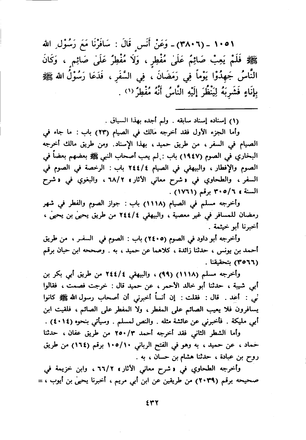 3806 - وَعَنْ أَنَسٍ قَالَ: «سَافَرْنَا مَعَ رَسُولِ اللَّهِ صَلَّى اللهُ عَلَيْهِ وَسَلَّمَ فَلَمْ يَعِبْ صَائِمٌ عَلَى مُفْطِرٌ، وَلَا مُفْطِرٌ عَلَى صَائِمٍ، وَكَانَ النَّاسُ جَهِدُوا يَوْمًا فِي رَمَضَانَ فِي السَّفَرِ، §فَدَعَا رَسُولُ اللَّهِ صَلَّى اللهُ عَلَيْهِ وَسَلَّمَ بِإِنَاءٍ فَشَرِبَهُ لِيَنْظُرَ إِلَيْهِ النَّاسُ أَنَّهُ مُفْطِرٌ» Kإسناده صحيح على شرط الشيخين