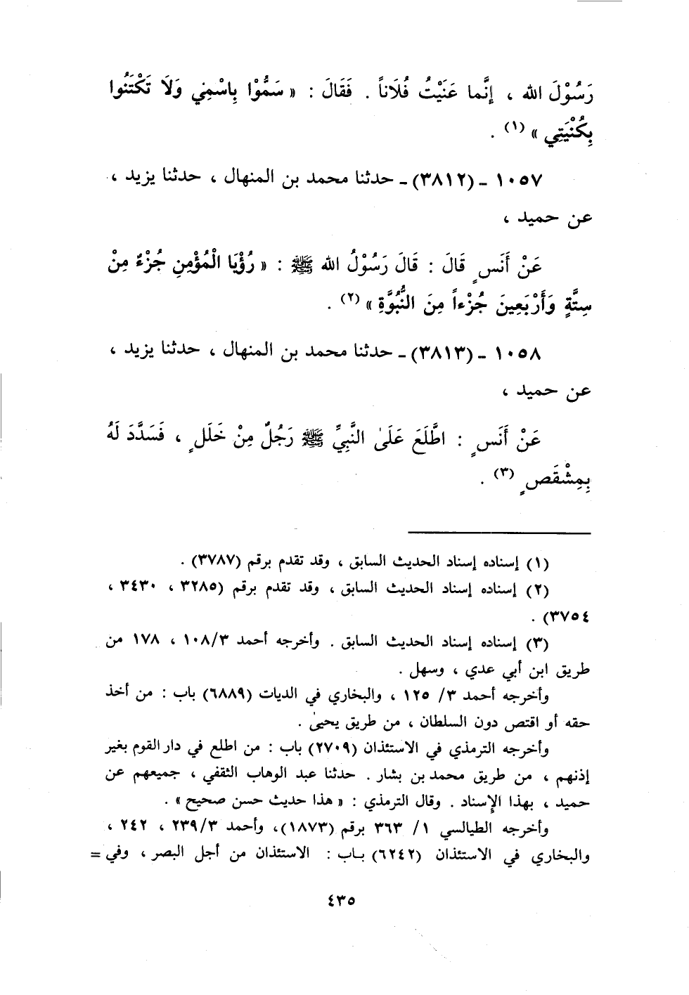3813 - حَدَّثَنَا مُحَمَّدُ بْنُ الْمِنْهَالِ، حَدَّثَنَا يَزِيدُ، عَنْ حُمَيْدٍ، عَنْ أَنَسٍ، «اطَّلَعَ عَلَى النَّبِيِّ صَلَّى اللهُ عَلَيْهِ وَسَلَّمَ رَجُلٌ مِنْ خَلَلٍ §فَسَدَّدَ لَهُ بِمِشْقَصٍ» Kإسناده صحيح على شرط الشيخين