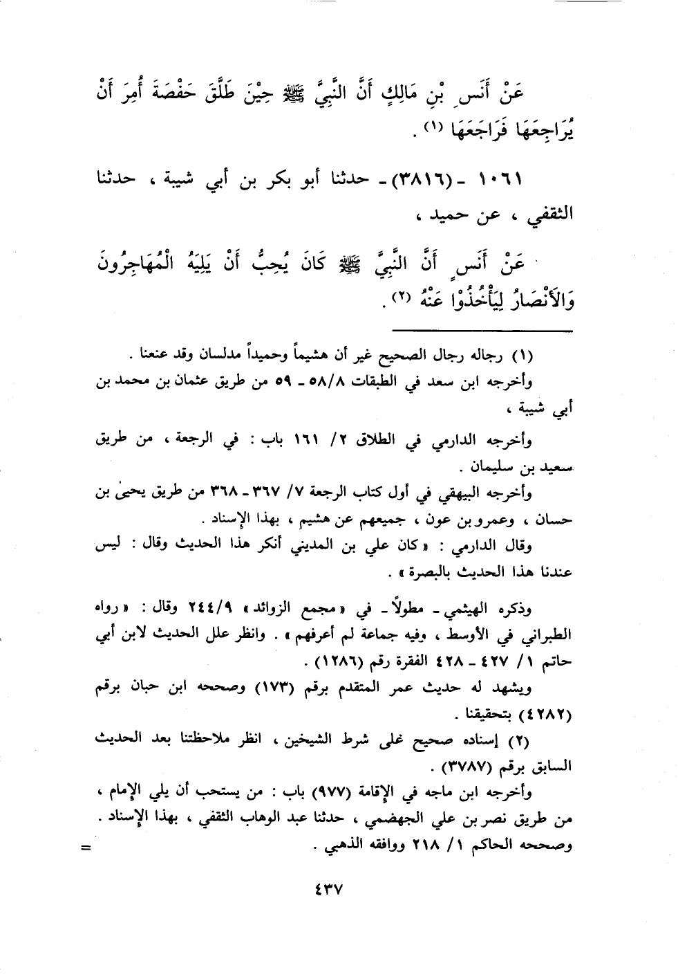 3816 - حَدَّثَنَا أَبُو بَكْرِ بْنِ أَبِي شَيْبَةَ، حَدَّثَنَا الثَّقَفِيُّ، عَنْ حُمَيْدٍ، عَنْ أَنَسٍ، «أَنَّ النَّبِيَّ صَلَّى اللهُ عَلَيْهِ وَسَلَّمَ كَانَ §يُحِبُّ أَنْ يَلِيَهُ الْمُهَاجِرُونَ وَالْأَنْصَارُ لِيَأْخُذُوا عَنْهُ» Kإسناده صحيح على شرط الشيخين