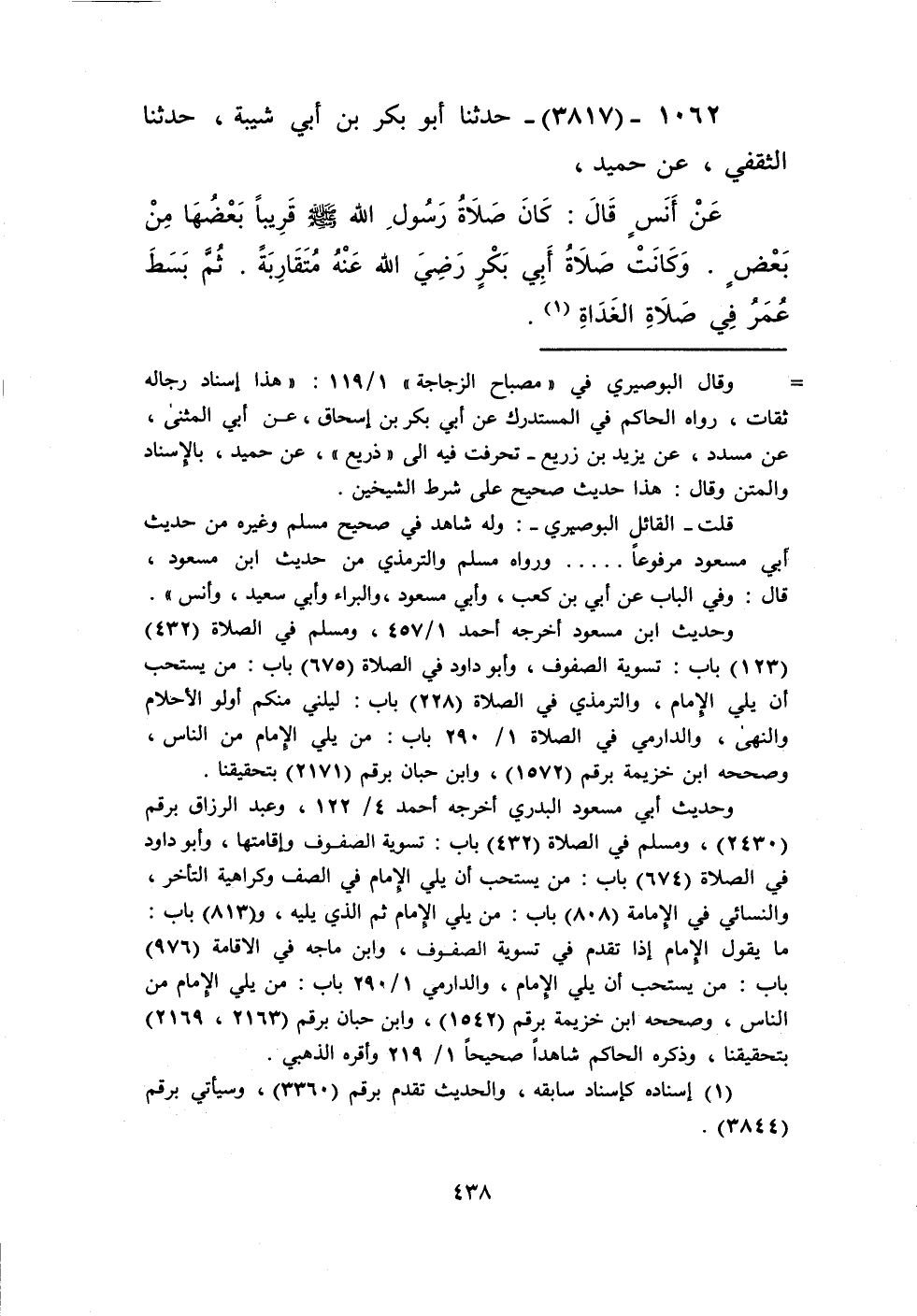 3817 - حَدَّثَنَا أَبُو بَكْرِ بْنِ أَبِي شَيْبَةَ، حَدَّثَنَا الثَّقَفِيُّ، عَنْ حُمَيْدٍ، عَنْ أَنَسٍ قَالَ: كَانَ «§صَلَاةُ رَسُولِ اللَّهِ صَلَّى اللهُ عَلَيْهِ وَسَلَّمَ قَرِيبًا بَعْضُهَا مِنْ بَعْضٍ، وَكَانَتْ صَلَاةُ أَبِي بَكْرٍ رَضِيَ اللَّهُ عَنْهُ مُتَقَارِبَةً، ثُمَّ بَسَطَ عُمَرُ فِي صَلَاةِ الْغَدَاةِ» Kإسناده صحيح على شرط الشيخين