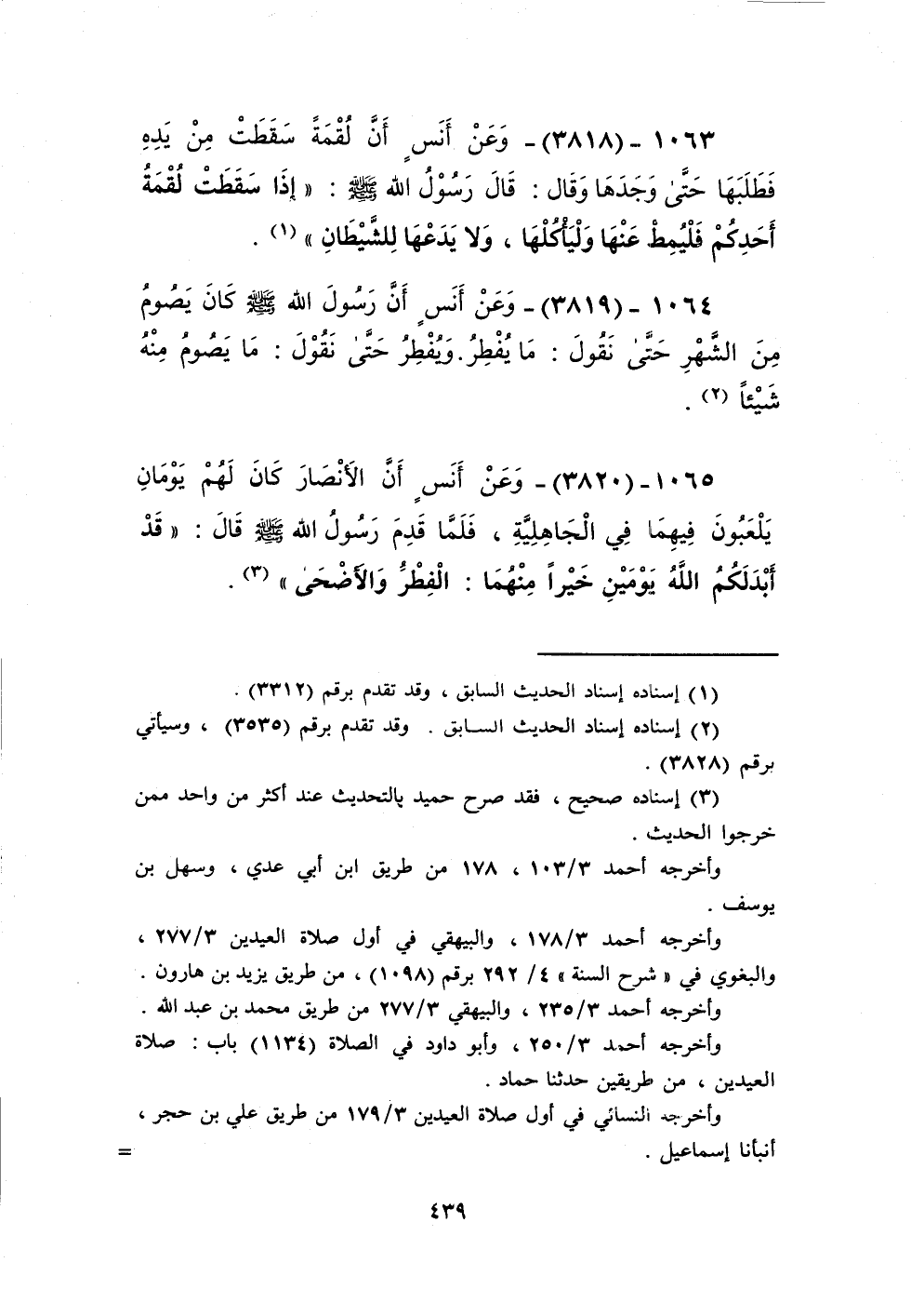 3820 - وَعَنْ أَنَسٍ، أَنَّ الْأَنْصَارَ كَانَ لَهُمْ يَوْمَانِ يَلْعَبُونَ فِيهِمَا فِي الْجَاهِلِيَّةِ، فَلَمَّا قَدِمَ رَسُولُ اللَّهِ صَلَّى اللهُ عَلَيْهِ وَسَلَّمَ قَالَ: " §قَدْ أَبْدَلَكُمُ اللَّهُ يَوْمَيْنِ خَيْرًا مِنْهُمَا: الْفِطْرَ وَالْأَضْحَى "Kإسناده صحيح