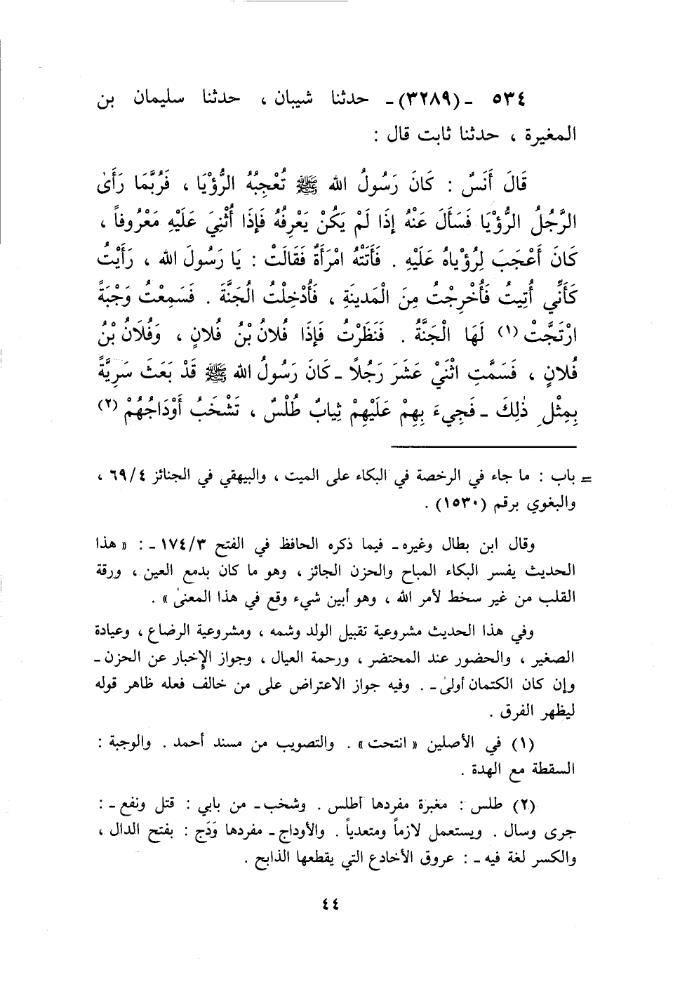 3289 - حَدَّثَنَا شَيْبَانُ، حَدَّثَنَا سُلَيْمَانُ بْنُ الْمُغِيرَةِ، حَدَّثَنَا ثَابِتٌ، قَالَ: قَالَ أَنَسٌ: كَانَ رَسُولُ اللَّهِ صَلَّى اللهُ عَلَيْهِ وَسَلَّمَ تُعْجِبُهُ الرُّؤْيَا، فَرُبَّمَا رَأَى الرَّجُلُ الرُّؤْيَا فَسَأَلَ عَنْهُ إِذَا لَمْ يَكُنْ يَعْرِفُهُ، فَإِذَا أُثْنِيَ عَلَيْهِ مَعْرُوفًا، كَانَ أَعْجَبَ لِرُؤْيَاهُ عَلَيْهِ. فَأَتَتْهُ امْرَأَةٌ فَقَالَتْ: يَا رَسُولَ اللَّهِ، رَأَيْتُ كَأَنِّي أُتِيتُ فَأُخْرِجْتُ مِنَ الْمَدِينَةِ، فَأُدْخِلْتُ الْجَنَّةَ، فَسَمِعْتُ وَجْبَةً ارْتَجَّتْ لَهَا الْجَنَّةُ، فَنَظَرْتُ فَإِذَا فُلَانُ بْنُ فُلَانٍ، وَفُلَانُ بْنُ فُلَانٍ، فَسَمَّتِ اثْنَيْ عَشَرَ رَجُلًا - كَانَ رَسُولُ اللَّهِ صَلَّى اللهُ عَلَيْهِ وَسَلَّمَ قَدْ بَعَثَ سَرِيَّةً بِمِثْلِ ذَلِكَ - فَجِيءَ بِهِمْ عَلَيْهِمْ ثِيَابٌ طُلْسٌ، تَشْخَبُ أَوْدَاجُهُمْ -[45]-، فَقِيلَ: اذْهَبُوا بِهِمْ إِلَى نَهَرِ الْبَيْذَجِ - أَوِ الْبَيْرِحِ - قَالَ: فَغُمِسُوا فِيهِ، فَخَرَجُوا وَوُجُوهُهُمْ كَالْقَمَرِ لَيْلَةَ الْبَدْرِ، فَأَتَوْا بِصَفْحَةٍ مِنْ ذَهَبٍ فِيهَا بُسْرَةٌ، فَأَكَلُوا مِنْ بُسْرِهِ مَا شَاءُوا، فَمَا يَقْلِبُونَهَا مِنْ وَجْهٍ إِلَّا أَكَلُوا مِنَ الْفَاكِهَةِ مَا أَرَادُوا، وَأَكَلْتُ مَعَهُمْ، فَجَاءَ الْبَشِيرُ مِنْ تِلْكَ السَّرِيَّةِ، فَقَالَ: كَانَ مِنْ أَمْرِنَا كَذَا وَكَذَا، فَأُصِيبَ فُلَانٌ وَفُلَانٌ، حَتَّى عَدَّ اثْنَيْ عَشَرَ رَجُلًا، فَدَعَا رَسُولُ اللَّهِ صَلَّى اللهُ عَلَيْهِ وَسَلَّمَ الْمَرْأَةَ فَقَالَ: «§قُصِّي رُؤْيَاكِ». فَقَصَّتْهَا وَجَعَلَتْ تَقُولُ: جِيءَ بِفُلَانٍ، وَجِيءَ بِفُلَانٍ، كَمَا قَالَKإسناده صحيح