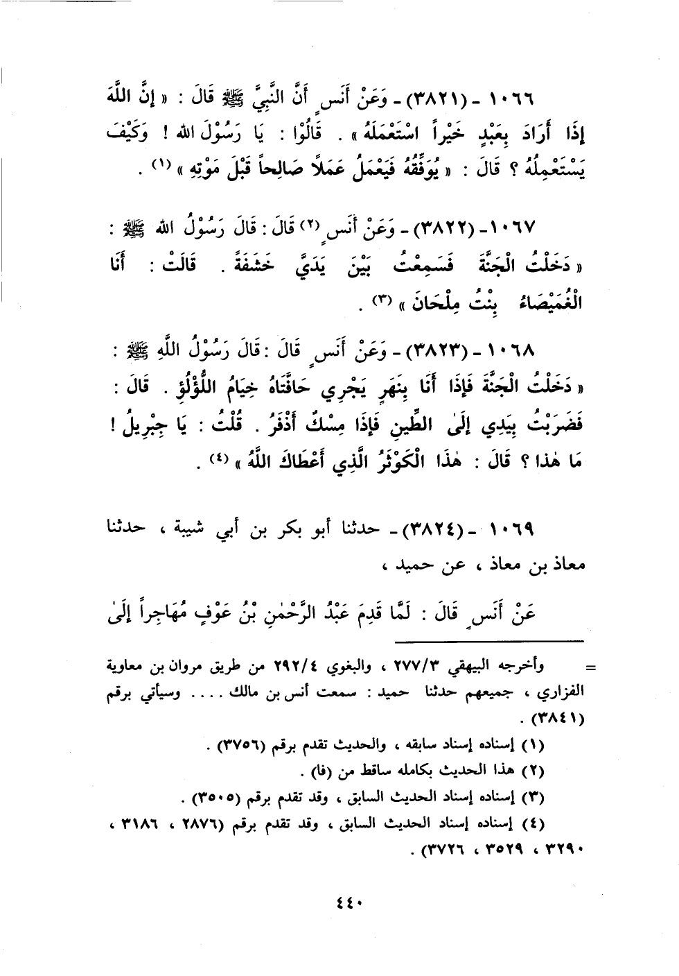 3821 - وَعَنْ أَنَسٍ، أَنَّ النَّبِيَّ صَلَّى اللهُ عَلَيْهِ وَسَلَّمَ قَالَ: «§إِنَّ اللَّهَ إِذَا أَرَادَ بِعَبْدٍ خَيْرًا اسْتَعْمَلَهُ»، قَالُوا: يَا رَسُولَ اللَّهِ، وَكَيْفَ يَسْتَعْمِلُهُ؟ قَالَ: «يُوَفِّقُهُ فَيَعْمَلُ عَمَلًا صَالِحًا قَبْلَ مَوْتِهِ» Kإسناده صحيح