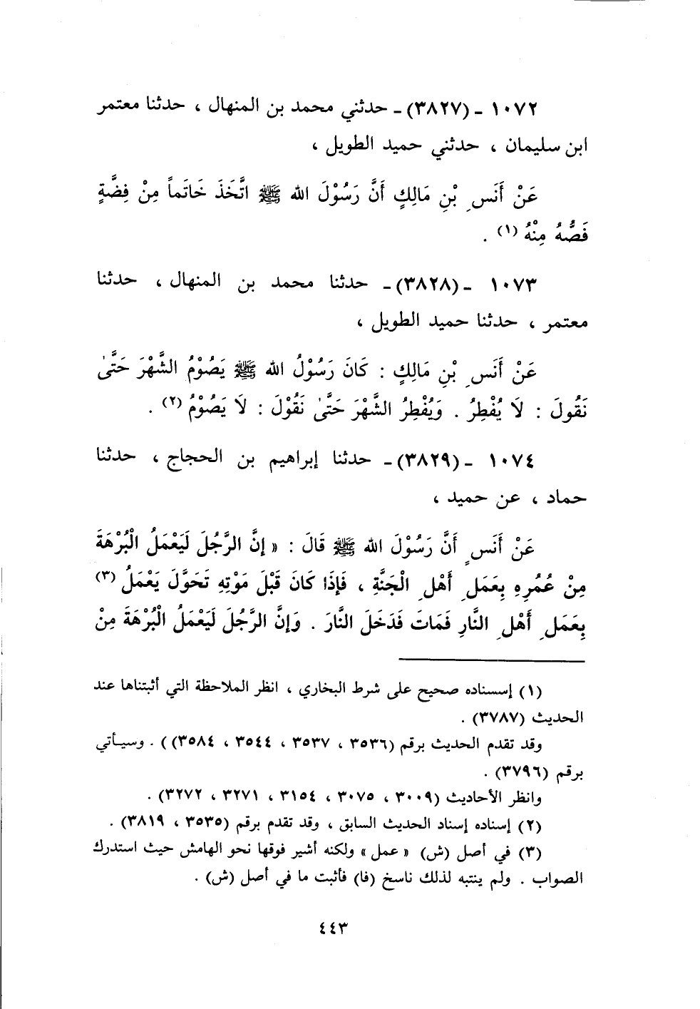 3828 - حَدَّثَنَا مُحَمَّدُ بْنُ الْمِنْهَالِ، حَدَّثَنَا مُعْتَمِرٌ، حَدَّثَنَا حُمَيْدٌ الطَّوِيلُ، عَنْ أَنَسِ بْنِ مَالِكٍ، " كَانَ رَسُولُ اللَّهِ صَلَّى اللهُ عَلَيْهِ وَسَلَّمَ §يَصُومُ الشَّهْرَ حَتَّى نَقُولَ: لَا يُفْطِرُ، وَيُفْطِرُ الشَّهْرَ حَتَّى نَقُولَ: لَا يَصُومُ "Kإسناده صحيح على شرط البخاري